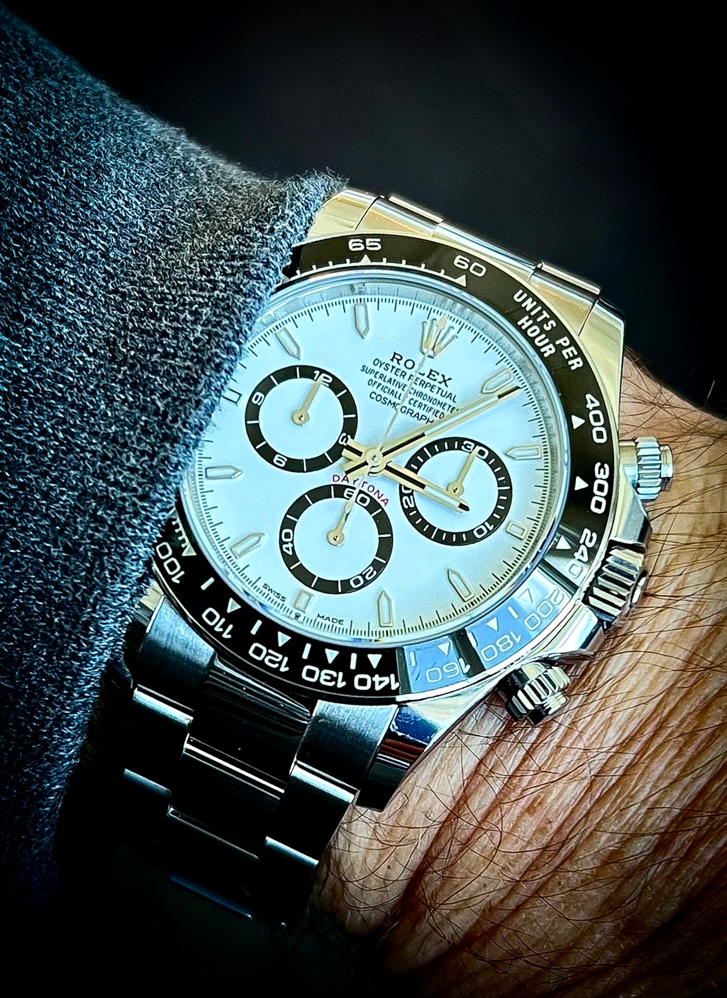 I also own both and feel that though they share a white dial they have different personalities. The Daytona is an evolution of a classic and this last version with the thin steel ring enclosing the ceramic bezel is a great improvement in looks over the previous model in my personal point of view. This watch has a very imposing presence on the wrist and I’m delighted to wear it though I confess it receives little use due to the hard safety conditions in my Country. The white dial Speedy is a very