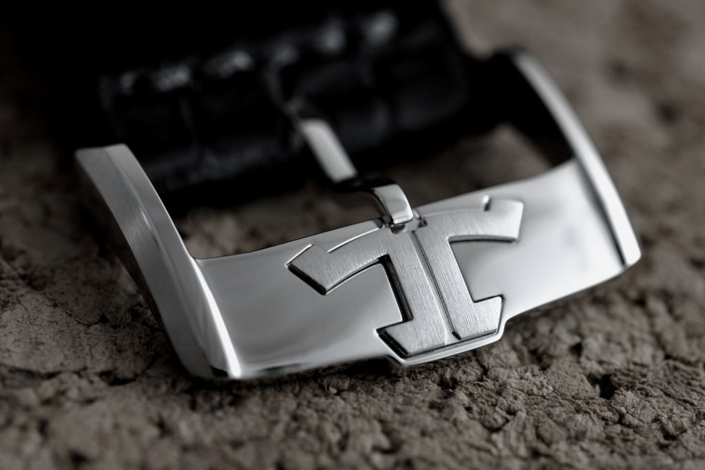 The slightly grey dial has an elegant grained texture.