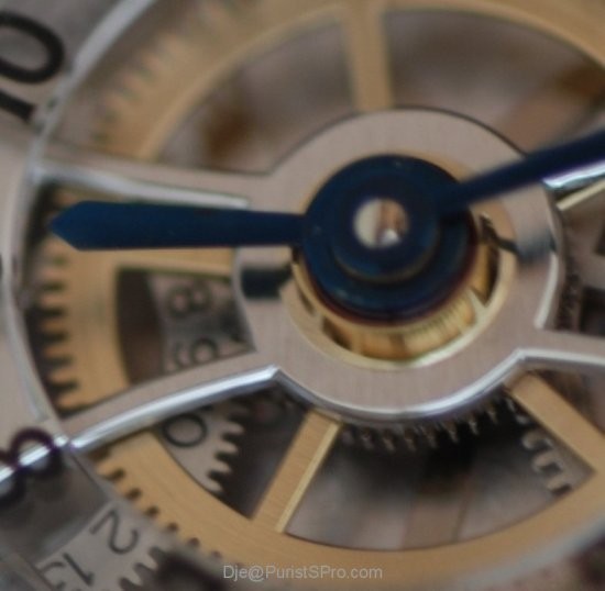 shows the hours and minutes through two heat blued hands on a sapphire dial at
