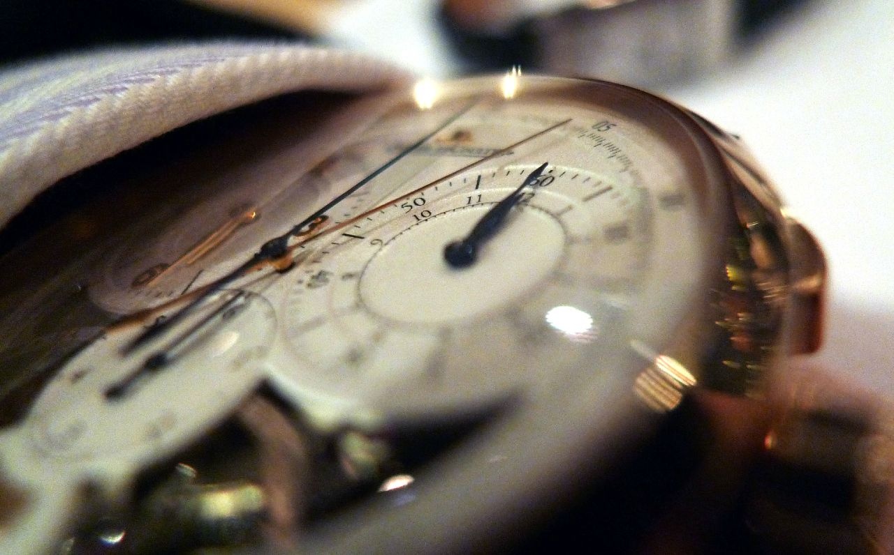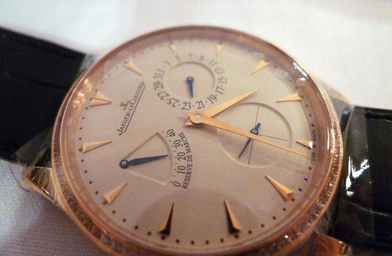39 x 9.9mm. This is a classic dial from JLC with the pointer date and RdM and seconds displays. Cal. 938 automatic with 43h PR, again with a thickness of only 4.9mm. Blued hands … and a diamond bezel.