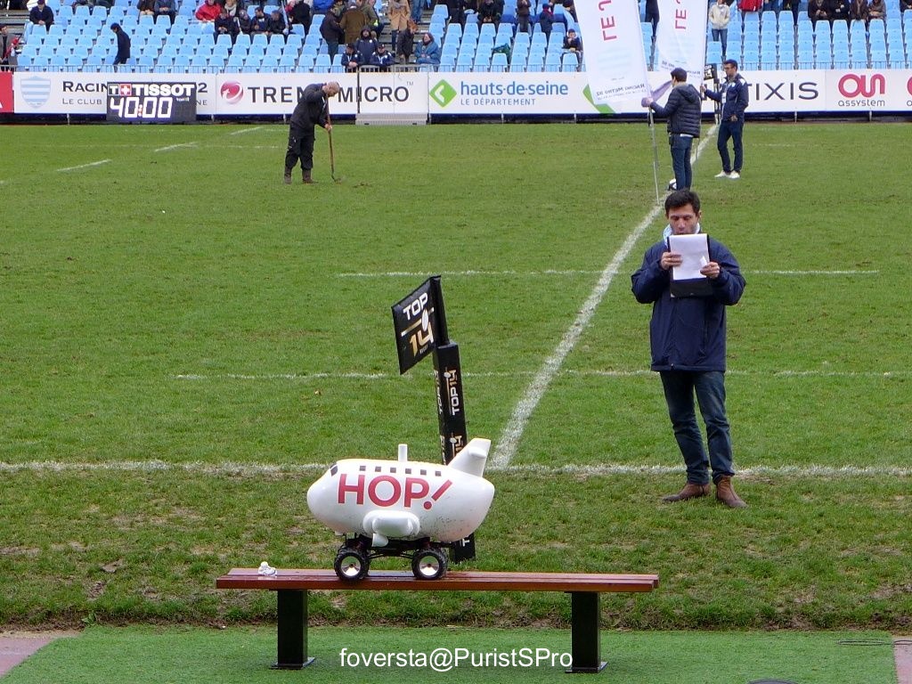 The small and funny plane on the foreground is used to carry the tee to the player who will kick the penalty.