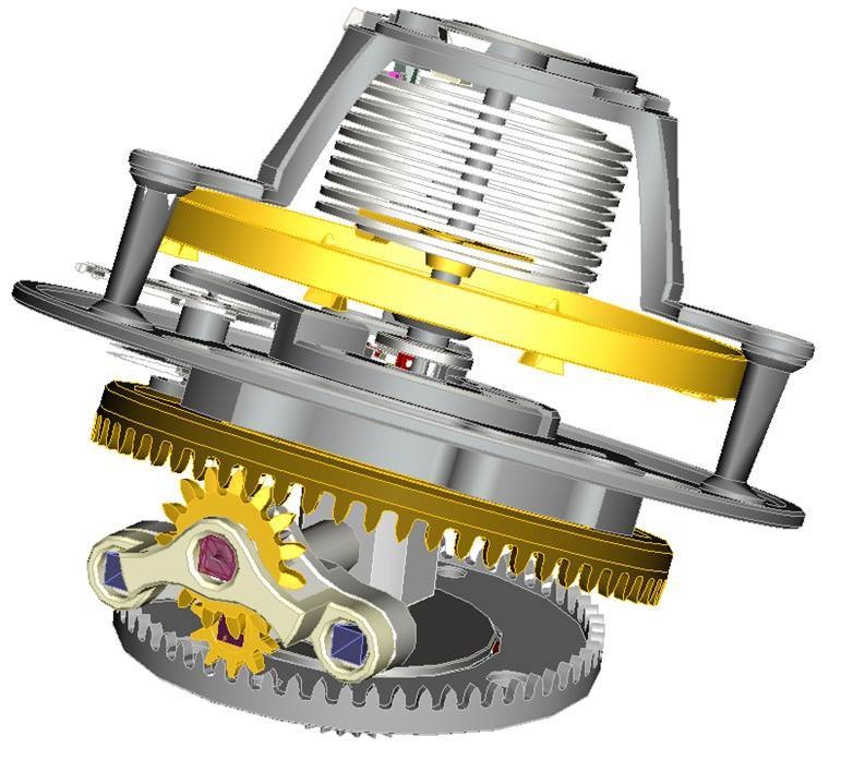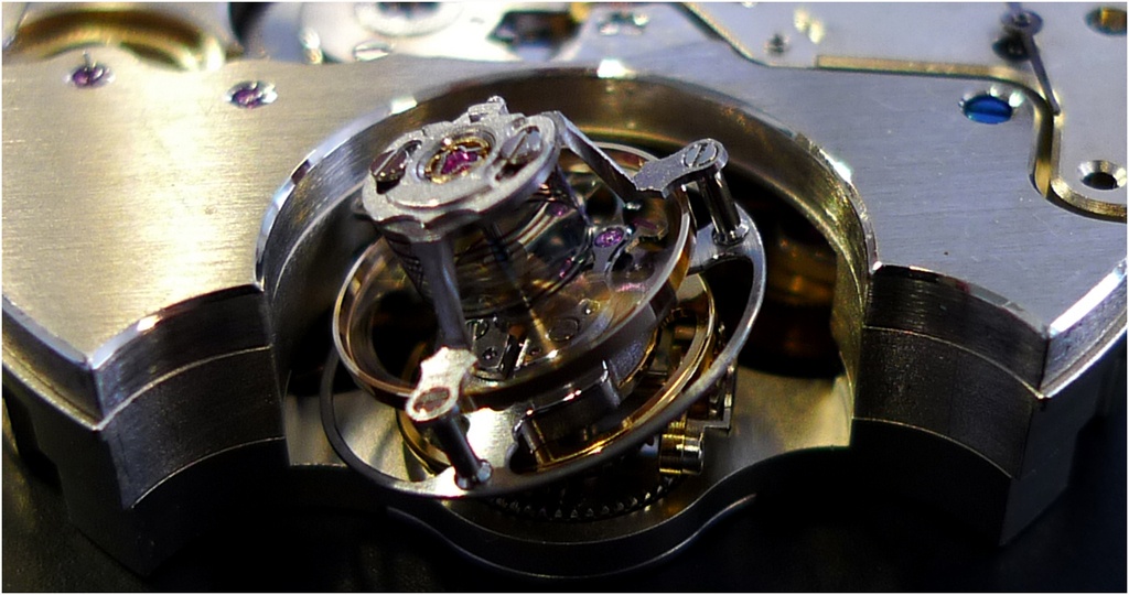 The Spherotourbillon is a two axis tourbillon, with two different speeds of rotation ( 15 seconds for the first axis, 30 seconds for the second axis ).