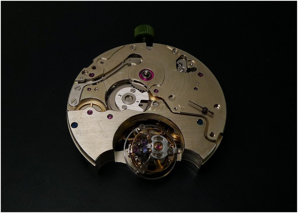 Made of 105 parts, weighting 0, 518 grams, this spherical tourbillon has a carriage made in titanium grade 5,an aluminium stud holder, and beats at 21 600 vibrations per hour.