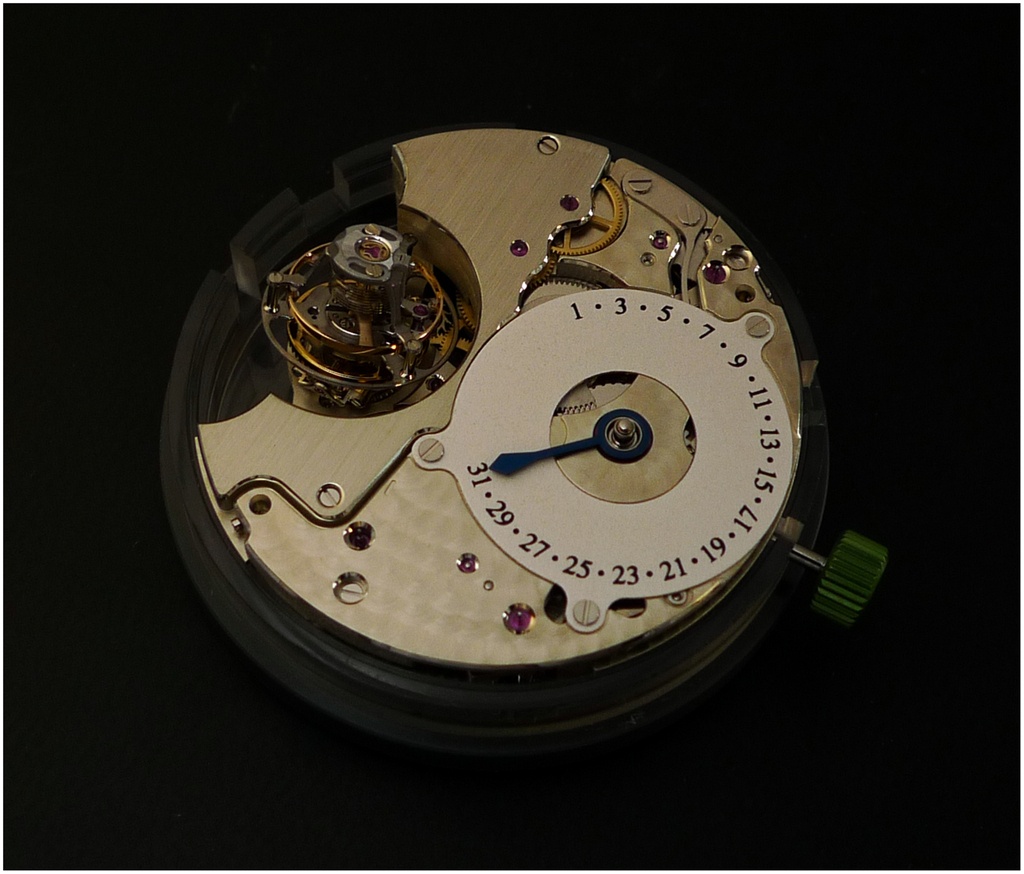 On the right, the subdial dedicated to Time, surronunded by the Date, which is jumping from the 31st to the 1st.