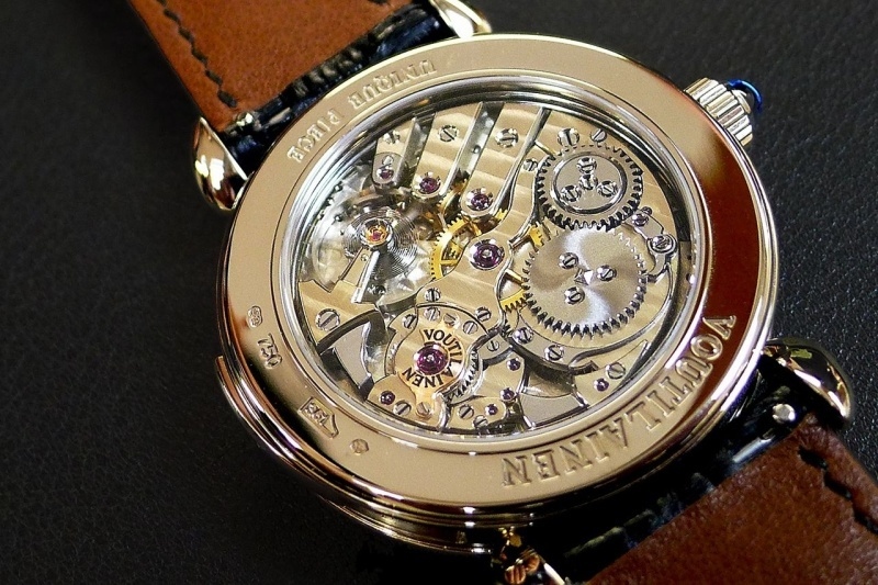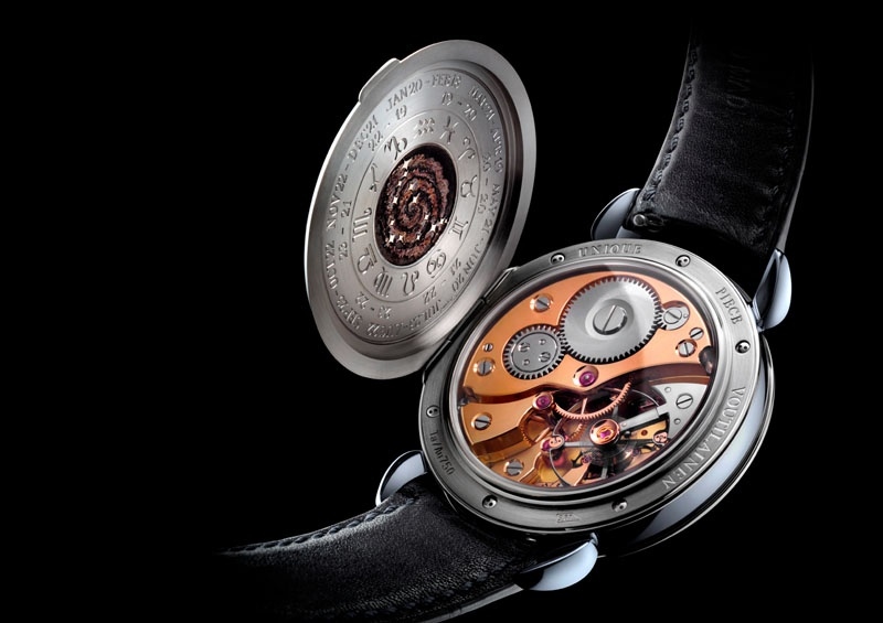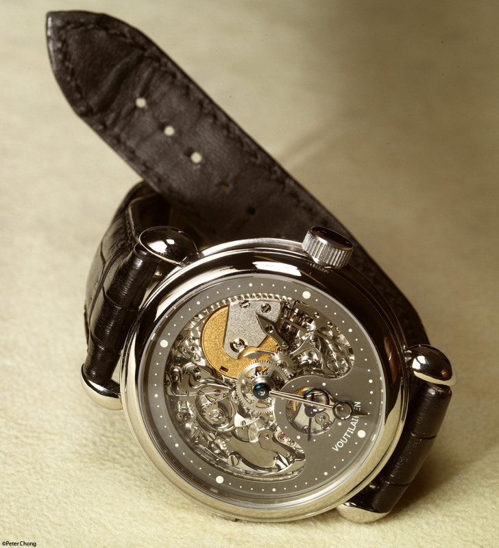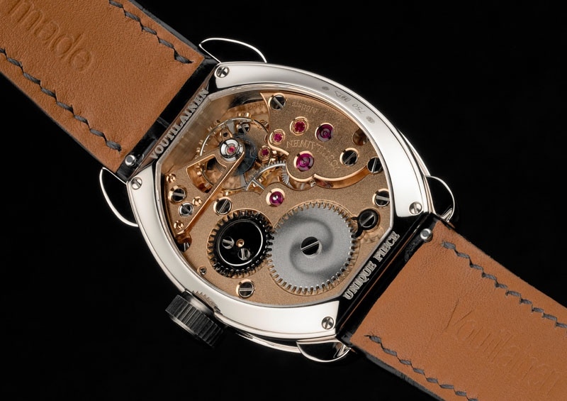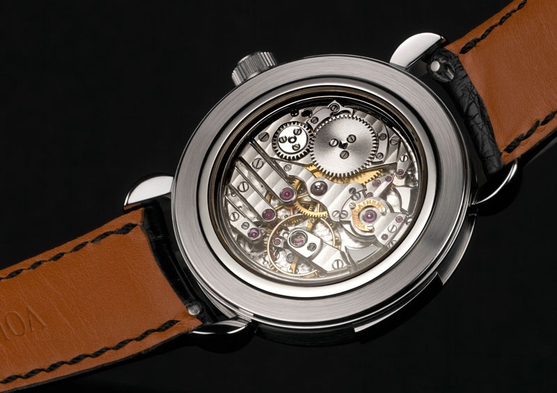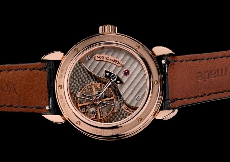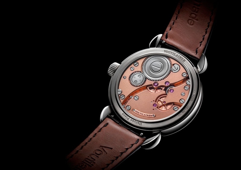 This piece is made of a special hardened steel (Stavax) used for sound propagation purposes and has an open-worked dial which is unique in what Voutilainen's has already done.