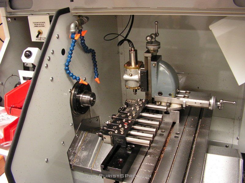 To this CNC lathe Kari has added a milling head from Schaublin as can be seen in the back. His allows gear cutting on this lathe. The machine is set up now to make the barrels for his new movement. The turning and gear cutting is all done in one pass to ensure absolute concentricity.