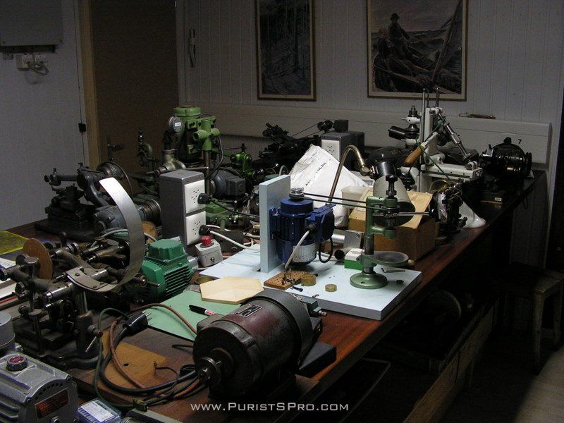 Here we see a reason for some great news from Kari. Soon he will be doing his own guillochage. Partially hidden by a cloth to keep it clean this is a rotary guillochage machine. I also saw two differrent machines for linear guillachage. This is very exciting and I can't wait to see the first dials done in house with these machines in Kari's shop.
