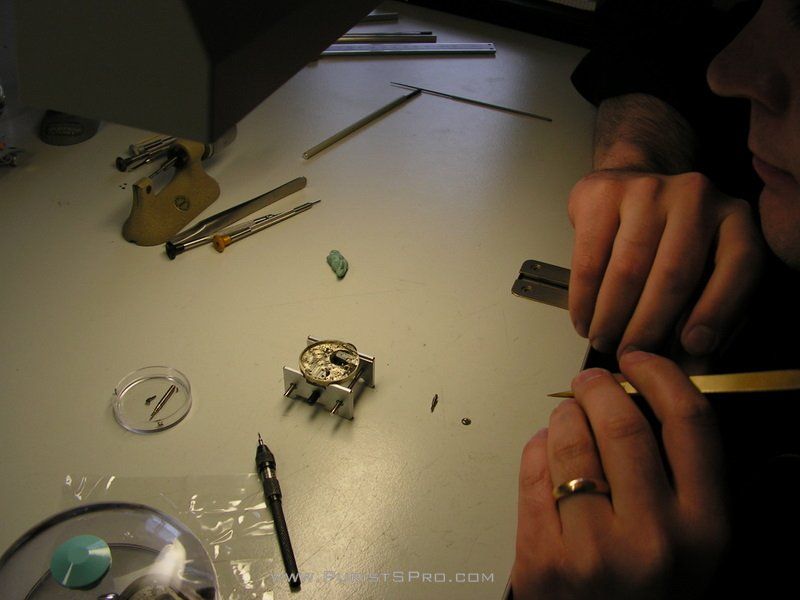 Here a watchmaker is preparing a repeater movement to place the jewels. I saw several repeater ebauches, kits of parts made in "the good old days". These kits were made by Le Coultre and are just the machined parts, not including the escapement and balance, and need a great amount of work to be completed.