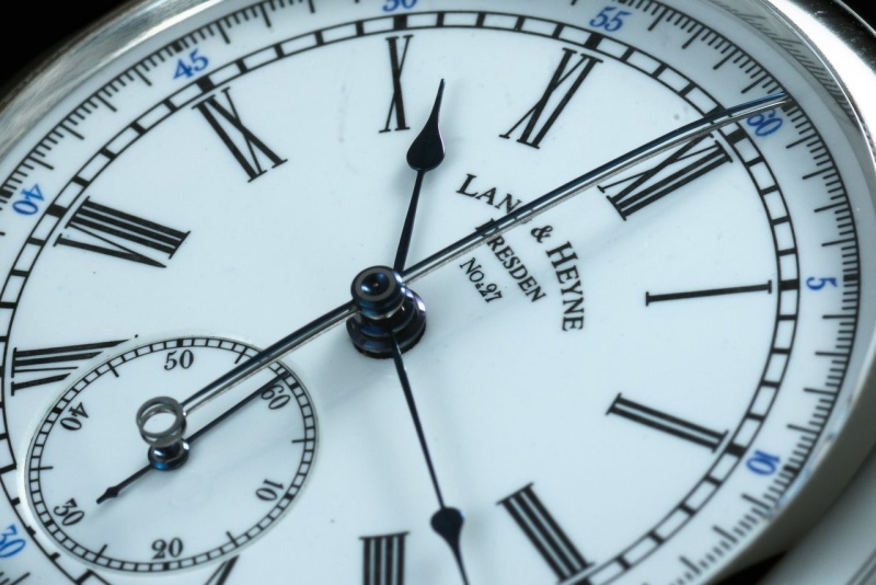I did not notice until it was pointed out to me - that the minute and second hands of the chronograph are slightly bent so that the exact time elapsed as shown by the counter is easier to read. How thoughtful!