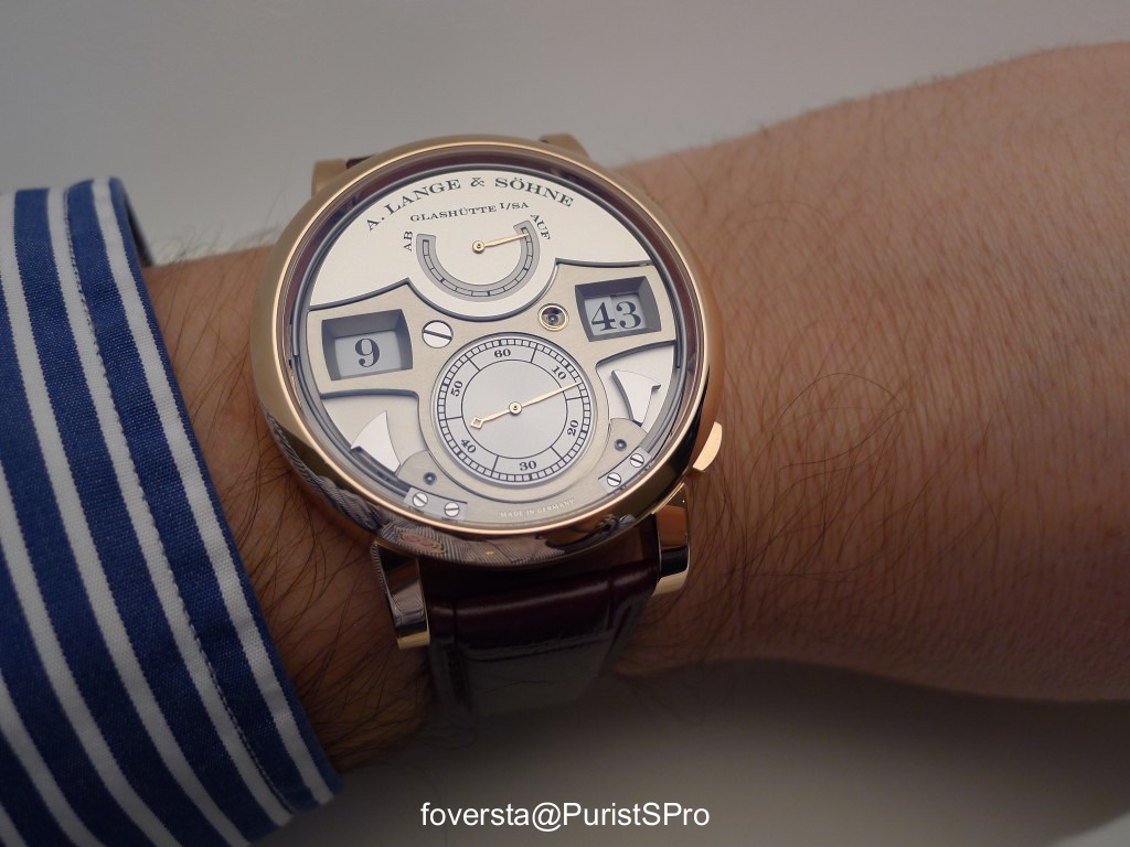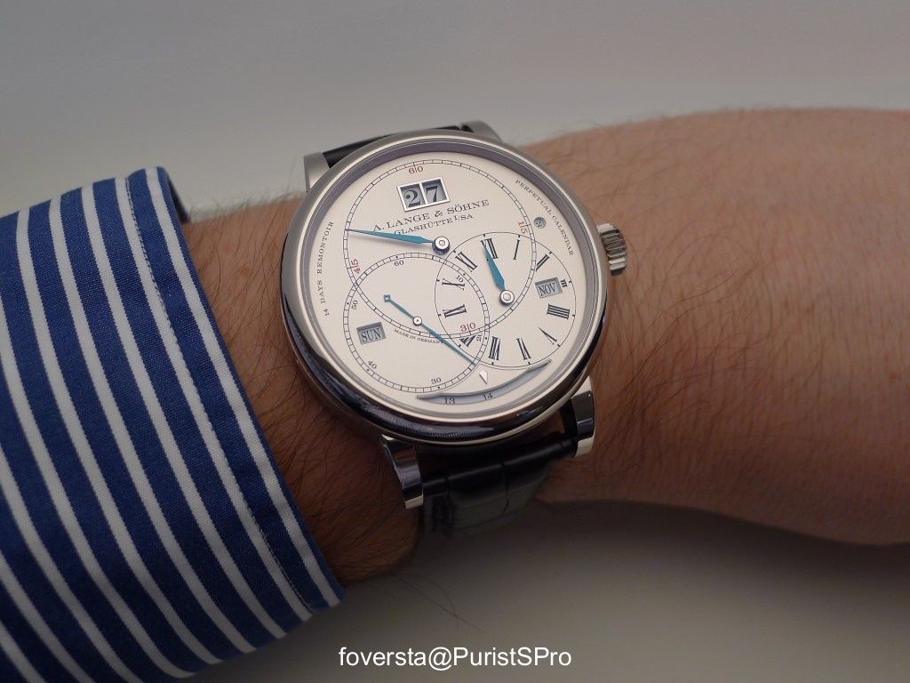 I already posted these pictures in HOME forum but it is important to do it in the Lange Forum. My first appointment at the SIHH was dedicated to Lange. I will obviously come back with a detail report. But please enjoy the wristshots I took today. The key piece was the Richard Lange PC Terraluna: And