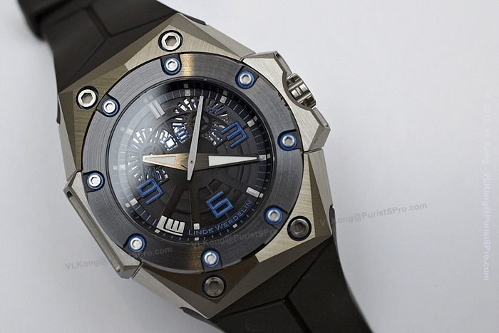 Case is of titanium while the bezel is of ceramic, their first inroad to use new materials. However, LW is adventurous to fabricate a non-flat top-profile and non-gloss surface ceramic bezel with eight cut-out slots. Tedious processes are added to machine the tapered bezel top and complete it with a brush-finish to blend with the brushed microbillé titanium caseband. To fasten the bezel to the caseband also needs extra thoughts. The alley-key screws will place tremendous pressure onto the hard and yet brittle ceramic surface when tightened and over time, screws may loosen by itself as there is less grip between the alley-key and smooth ceramic surface. To ensure both side-effects do not crop up, tension rings were introduced. Not just plain steel rings were used but matching colours laminated tension-rings were specially ordered to provide both the functional and aesthetic aspects. Indeed the Danish industrial design philosophy of design must be useful and functional besides pleasing to the eyes.