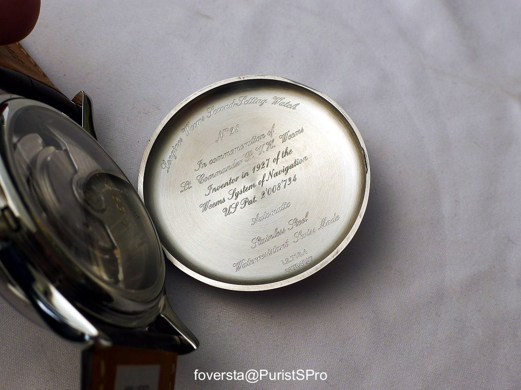 The Weems Second-setting watch is maybe one of the most famous pieces of the current collection. Its diameter is huge (47,5mm) but the main feature is the internal rotating dial for synchronization of the seconds hand with the radio time signal.Caseback can be opened to discover the movement L699 which is actually a Valgranges A07 111. The white lacquered dial is very nicely made with its Breguet figures and hands. On my wrist it looks bigger than, let's say, a Panerai with a similar size. it is due to the light colours of the dial, the shape of the lugs and of course... the oversized crown!