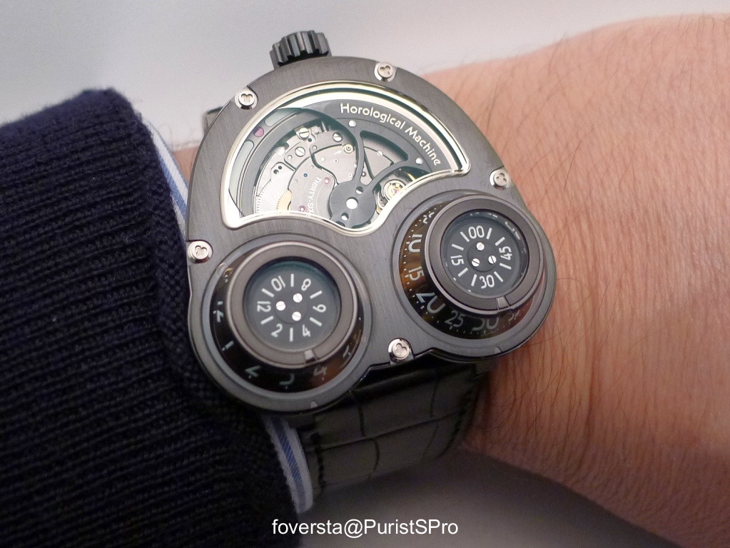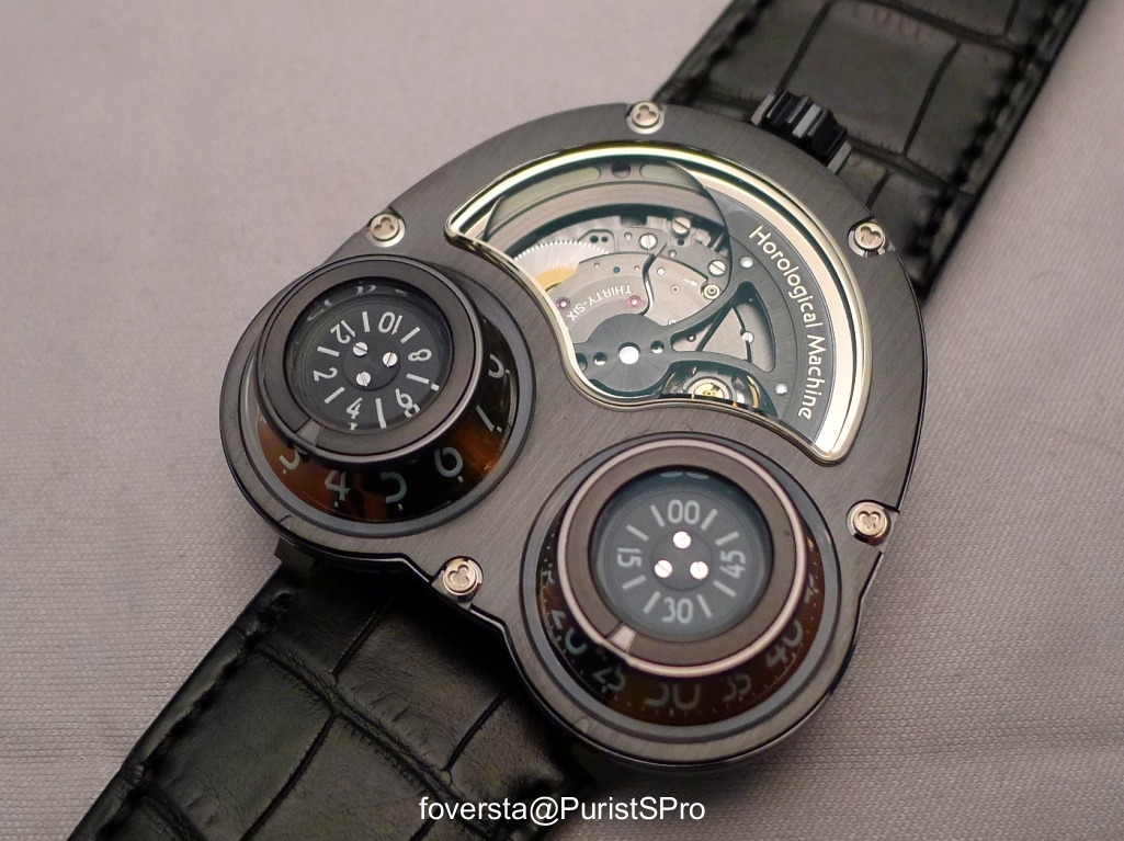 The dominant black treatment has another virtue. It reduces the perceived size of the watch. It is a good point because if the wearing comfort remains as always excellent thanks to the efficiency of the folding clasp, it must be remembered that the dimensions of the HM3 remain relatively impressive especially when it comes to the thickness due to the size of the domes (47x50x17mm ). Nevertheless, thanks to its shape, its aesthetic harmony, the location of the crown at the top of the case, this size does not shock because it is consistent with the proposed functions. The domes need to be sufficiently high and wide to be readable and the top opening must be generous to make the show of the winding mass as spectacular as it can be... in bright conditions or in total darkness!