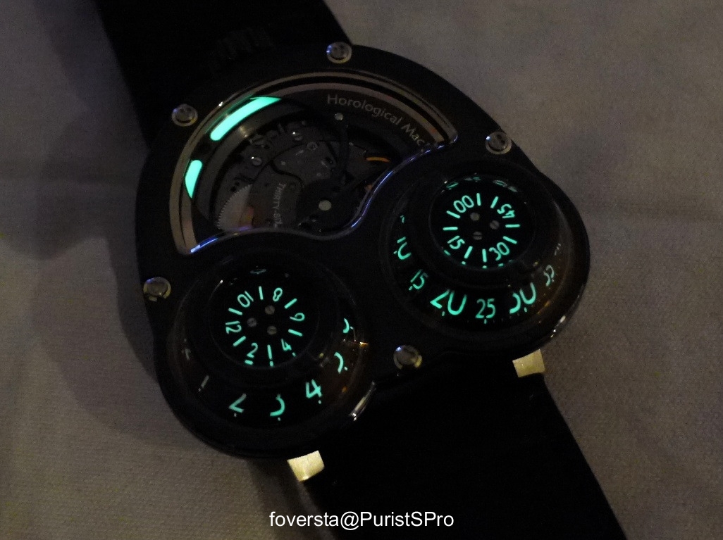 Thanks to the SuperLumiNova GL Grade A C3, wisely used on the figures dedicated to the time display and on the segments located behind the rotor, the HM3 Megawind Final Edition offers more than a traditional luminescence to read the time in the dark. The domes thus become bright on both their sides and their upper parts dramatically reinforcing the embossed design of the Machine. But that's not all: thanks to the special speed of rotation of the rotor, the luminous segments disappear or reapper according to the movements of the wrist what produces a striking strobe effect! The choice of the Megawind base becomes clear in this context. This visual success is due to the efficiency of the luminescent substance whose green color, purety and brightness contribute to illuminate flawlessly the HM3.