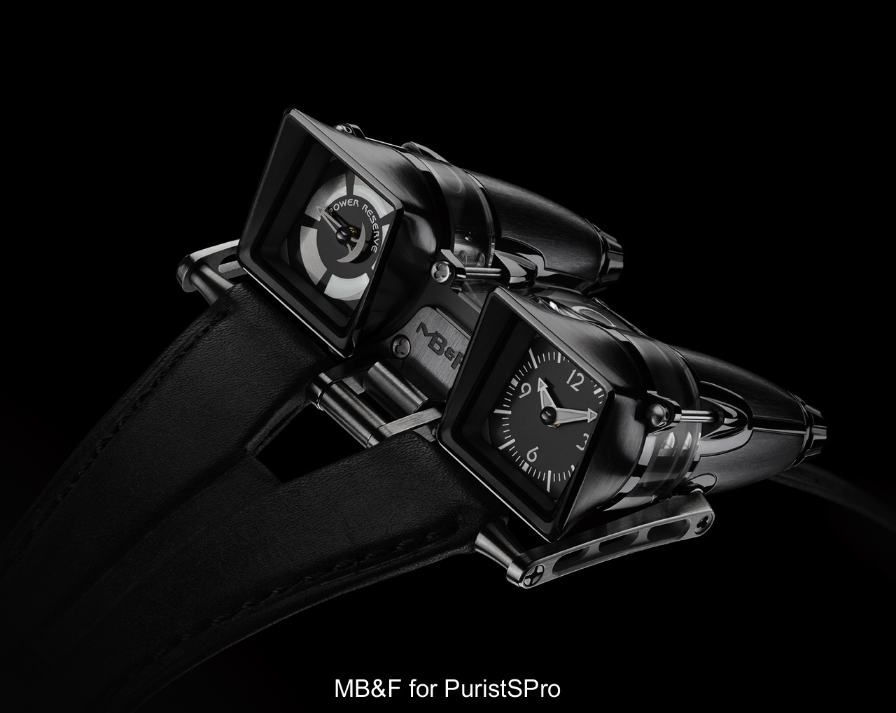 Hours and minutes on right dial, power reserve indicator on left dial