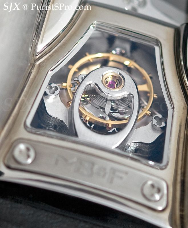 Though the Horological Machines are better known for design than finishing, the HM4 possesses a surprisingly high level of finish, better than that of the earlier Machines. One limiting factor of the HM2 and 3 was the Girard Perregaux base movement, in contrast the HM4 uses an entirely new calibre, developed by Laurent Besse and Beranger Reynard, on which decorative finishing can be well exhibited. The sapphire band running around the case exposes much of the movement, while the balance cock is strategically located. Interestingly the balance wheel is a traditional screwed balance, which looks out of place on such a watch.