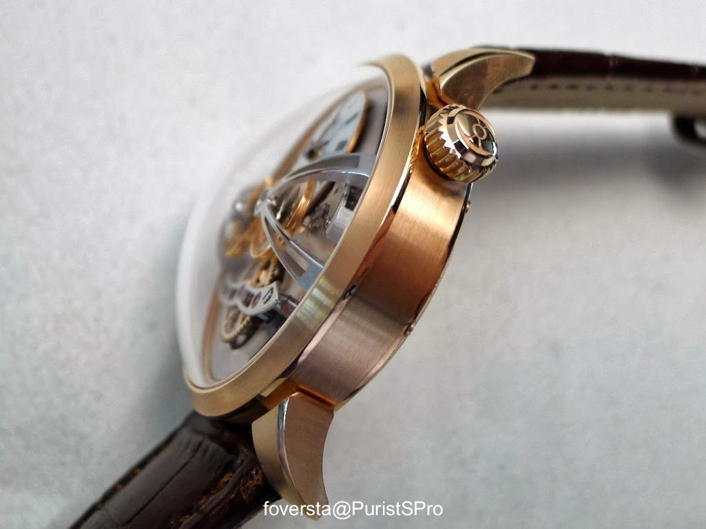 The location of the two balance wheels requires the four arms to have a vertical curve steeper than the two arms of the LM1. The shape of the domed sapphire crystal is actually slightly different and the LM2 has a maximum height of 20mm against 16mm for the LM1. Anyway, the arms are as always beautiful, at the same time imposing and light. They remind me more the work of an architect than a pure component of a watch.