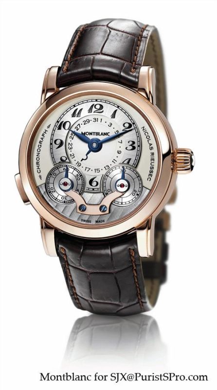 This Montblanc watch is the first one ever to feature a movement that has been developed, produced and assembled in Montblanc’s own workshops. The watch is dedicated to Nicolas Rieussec, who invented the chronograph in 1821: his was a wooden case containing a clock movement that drove two rotating dials on the lid. Above them was a fixed index that left a drop of ink on the rotating dials whenever a button was pushed. For the first time ever, the device made it possible to record the exact times put up by individual horses at racing events. The principle used gave the chronograph its name and comes from the Greek: chronos for ‘time’ and graphein for ‘write’. It seems only logical that the first watch movement to be developed by Montblanc, which has established itself as the world's leading manufacturer of top quality writing instruments, should be one that 'writes time'. The principle of the rotating dials was the inspiration for the design of the new Montblanc chronograph and gives the watch its unmistakable appearance.