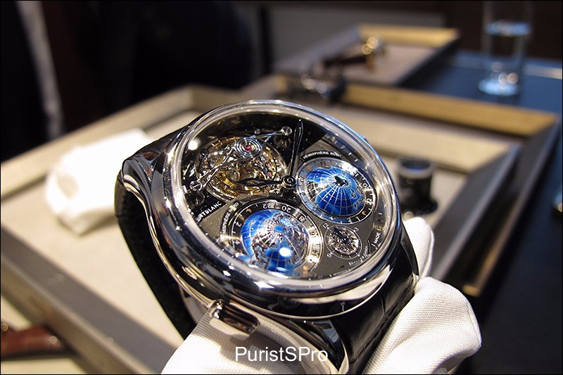 Similar high artisanal standards can be found on this watch, just like the red gold version including the two handpainted spheres and a solid 18k gold dial.
