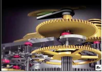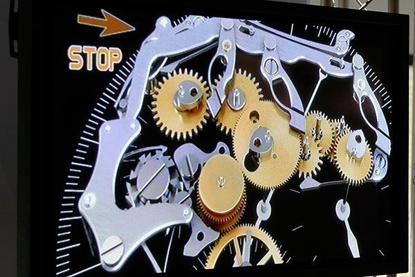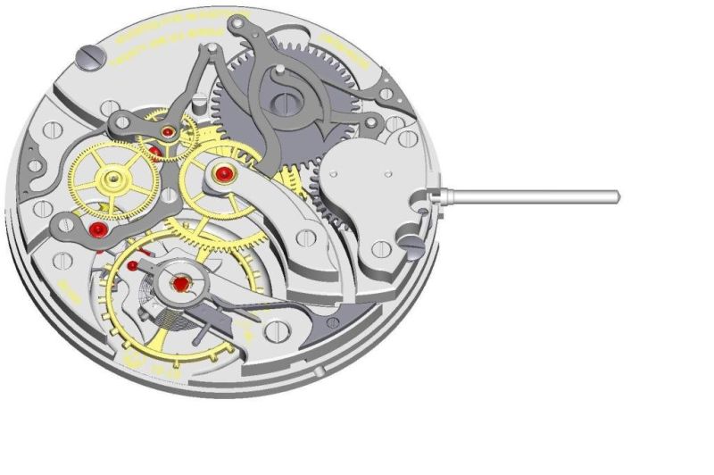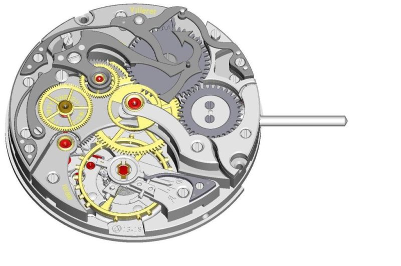 To reset the seconds hand to zero, the center wheel is uncoupled and a hammer descends on the heart shaped cam to turn the chronograph center wheel back to the zero position. The hammer stays on the heart cam holding the seconds hand at zero while the time is set. When the crown is pushed back in, the hammer is released, and the chronograph center wheel is coupled back into the energy flow, starting the movement of the center seconds hand.