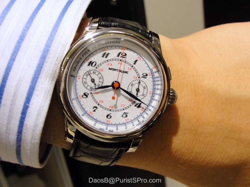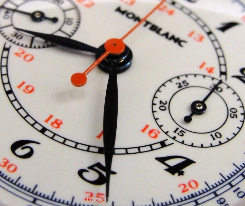 It's a beautiful piece indeed -- the Vintage Pulsographe from Montblanc's Villeret 1858 collection. A wonderfully finished piece housing MB caliber 13.21. I love the size --39.5mm. In white gold the grand feu enamel dial simply captivates me. Didn't it look nice on Anthony's wrist in my picture? It would be a nice birthday present for you, Vlad! The beautiful v-shaped chronograph bridge of the MB caliber 13.21: Wait for Anthony's pictures! I'm sure they will be great! Cheers, Daos