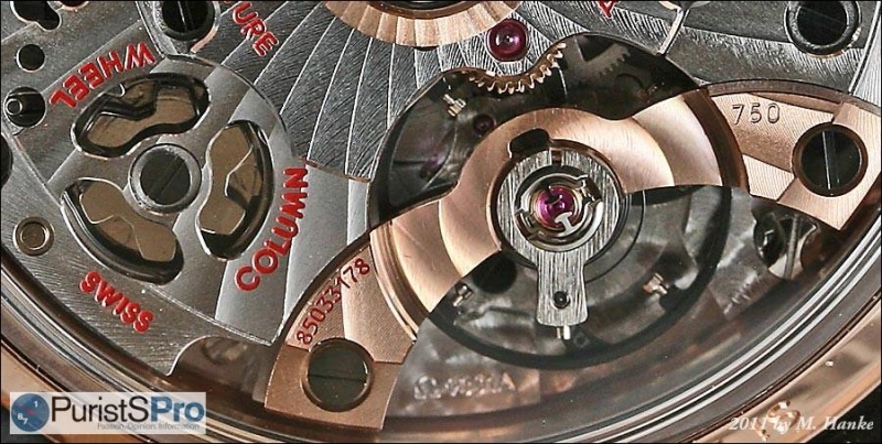 chronograph movement has a silicon hairspring and co-axial escapement,