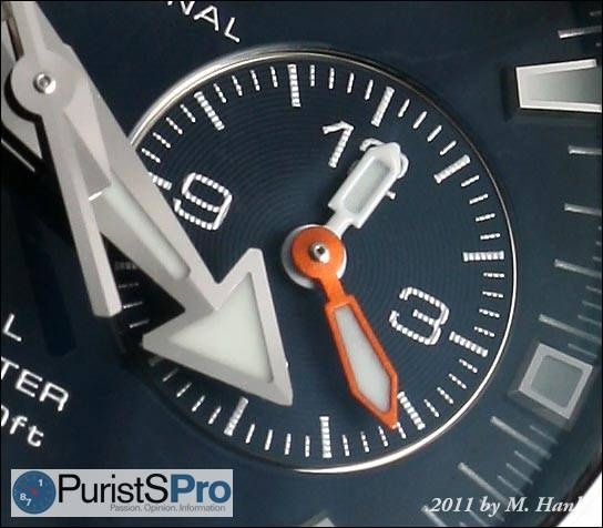 This variant is also available as a three hands diving watch, also with 45.5 mm diameter.