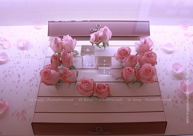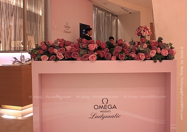 The Ladymatic showcase surrounded by fresh pink roses (watches were removed to maintain the suspense for later) ...
