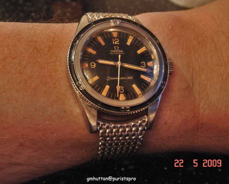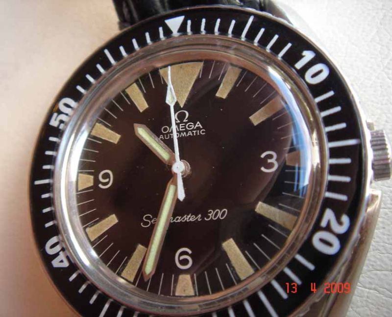 firstly a bit of history behind the Seamaster 300. it was first released in 1957 along with the speedmaster and the railmaster making an iconic trio of tool watches. despite being called the 300 it was in fact waterproof to 200m. it went through several changes over the years pretty much in line with the speedmaster. the first case was symmetrical with flat lugs and thin bezel. it had a series of different reference numbers ending in the 165.014 which dates from roughly 1962-1964. the second case shape was assymetric with curved lugs and larger bezel. this case resembles the speedmaster we all know so well. this bore the reference 165.024 and dates from 1964 to the end of production in the 70's. the early models which are the ones i will be referring too have no date, but in 1965/66 a date model was introduced with the reference 166.024. at about the same time the watch was given a larger screwdown crown. there were 2 dial variations, the first with a small lume marker and numerals at 12 and the second with large triangle lume marker and no numerals at 12. the very early models had several different types of hands, but the 2 main styles we see now are lumed stick hands and the large dagger hour hand.