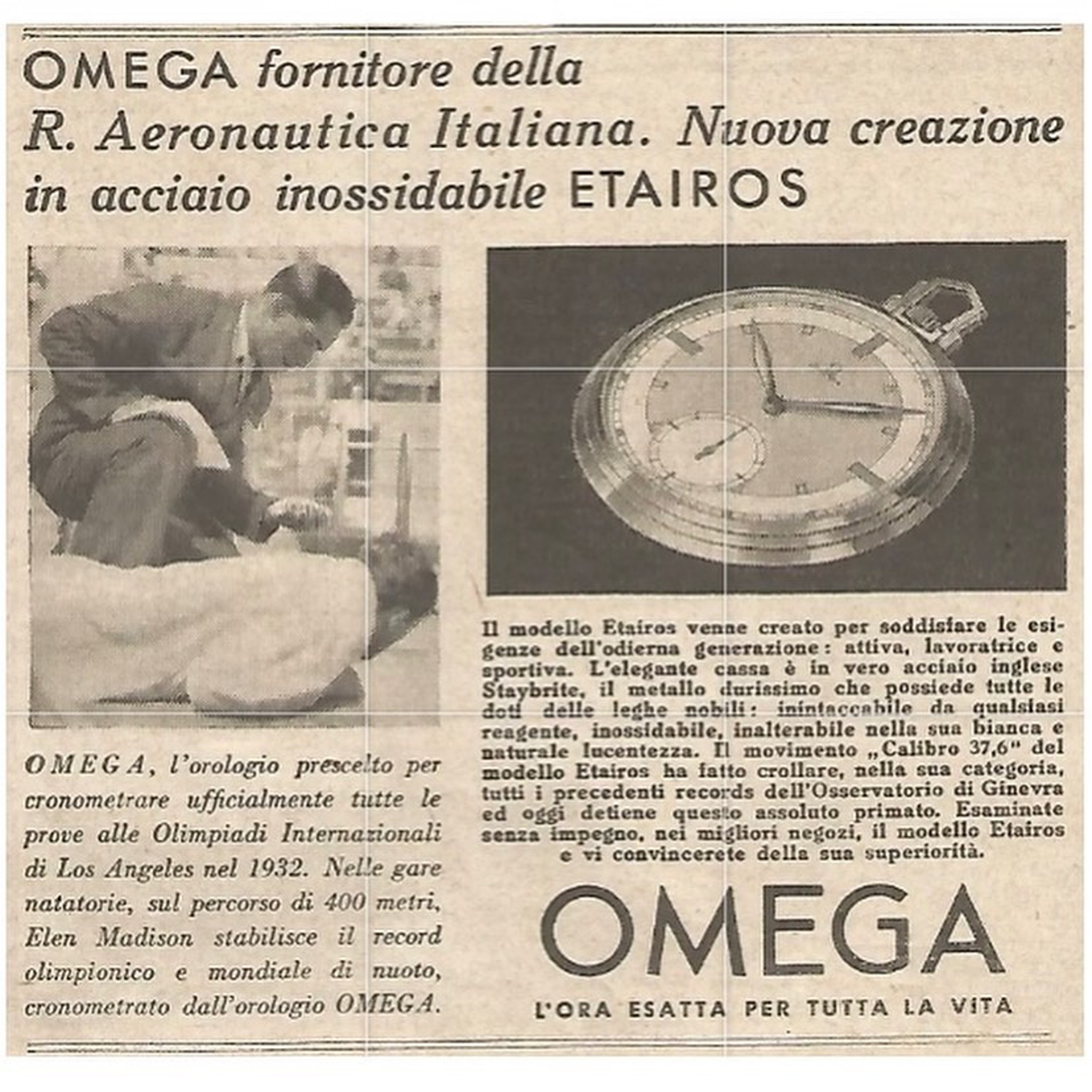 OMEGA, the watch chosen to officially time all events at the 1932 Los Angeles International Olympic Games. In the swimming events, over the 400-meter course, Elen Madison sets the Olympic and world swimming records, timed by an OMEGA watch."
