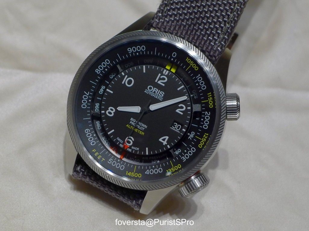 I attended a few days ago an event organized by the Bucherer boutique in Paris to celebrate the unveiling of the Oris Big Crown ProPilot Altimeter. This new Oris is not a mere watch, it is claimed to be the first automatic wristwatch with a mechanical altimeter. The word "automatic" is very important in this sentence since I already know other watches with such add-on which were released previously: the Breva Genie 01 and 02. But of course... we don't speak about the same price tag!