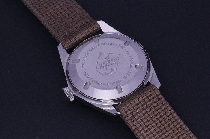Movement is an standard Oris caliber 733 based in a Sellita SW200, automatic winding, and the big rown is of the screw type to assure its waterproofness.