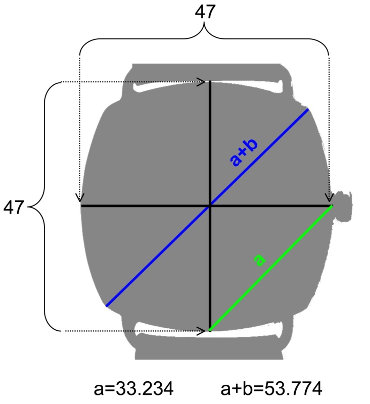 It’s not rectangular, so that was not a way it was applied. I first considered whether the ratio of the side of the square that would represent the whole diameter (47mm) versus the side of the square formed by the actual corners might be a golden ratio. Nope; that didn’t work because it would have been far too extreme.