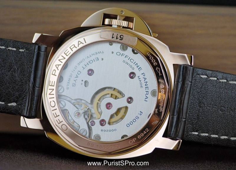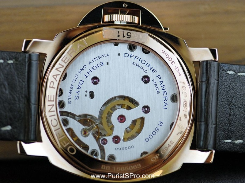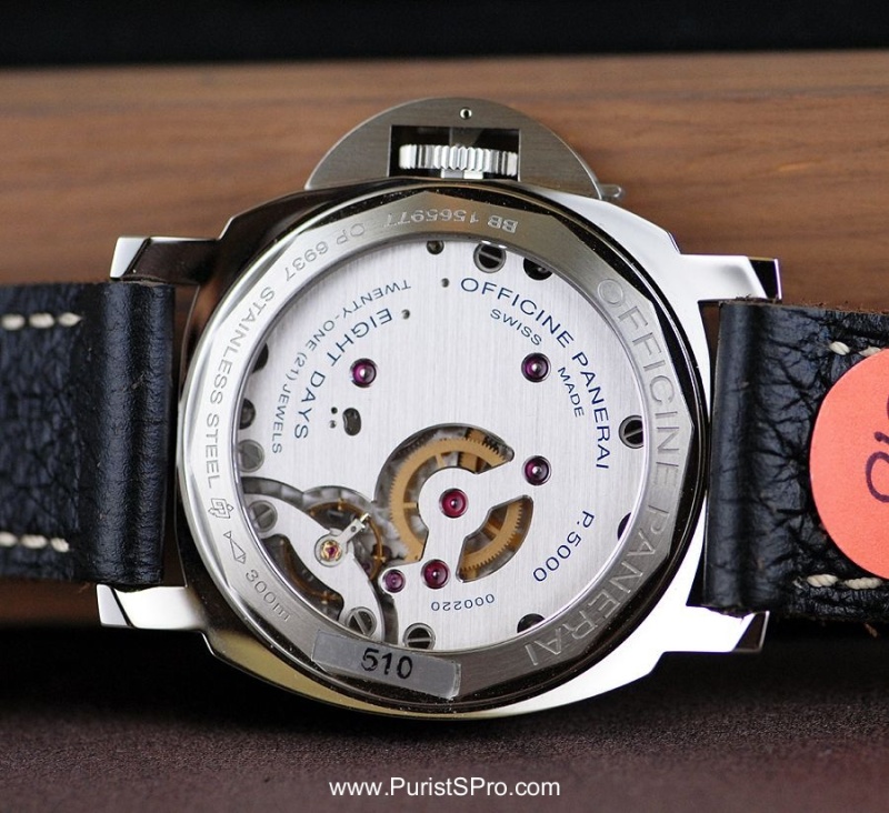 One thing I want to point out is the P.5000 has no quick reset seconds hand feature like that of the P.2000 movement. I guess with the entry level model, you can't expect to get it all. I'm also pleased that Panerai made this a 8-day power reserve instead of 3-days like in the P.3000 movement. 8-days power reserve matches well with Panerai's history