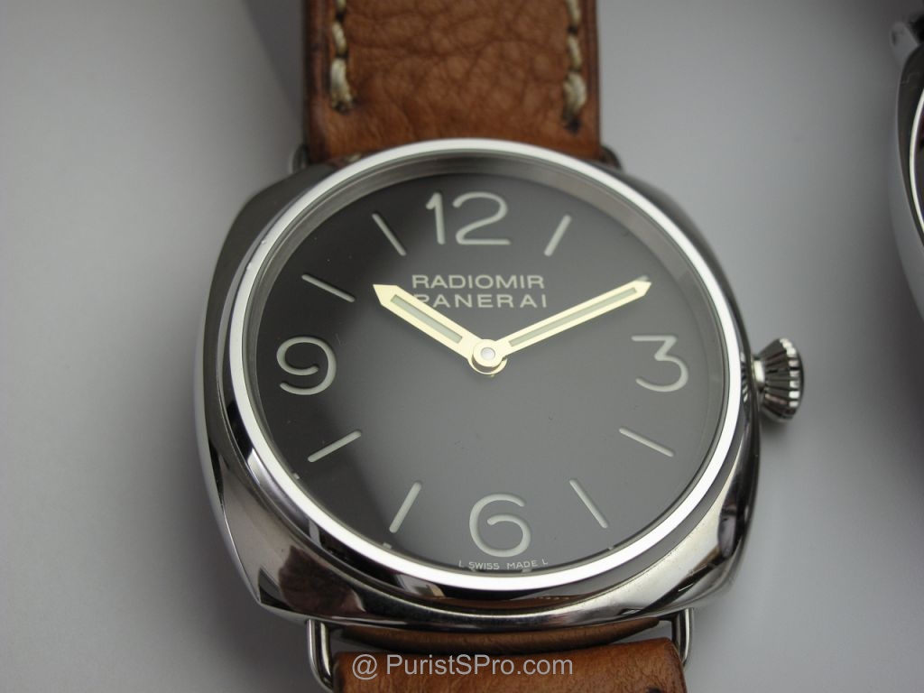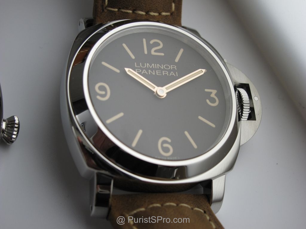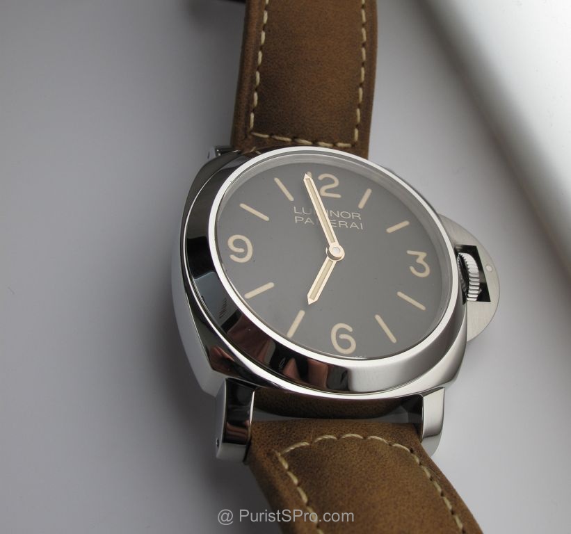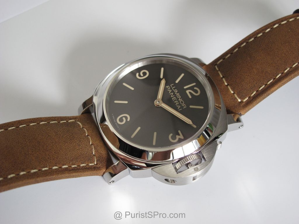 The Panerai 390 is a real beauty with the famous "chocolate" dial and aged patina application for the numeral and index application. The watch sports the classic OP1 movement with a highly polished case reminiscent of the PAM 000. In fact it is very similar except for that gorgeous brown dial and aged patina that give a more historic feel to it. And yes Gold hands that pop unlike the subdued hands of the PAM 000 which almost blend into the background. OK I won't bore you with and more fluff and take you to the pictures. On a side note the brown dial is almost impossible to represent in photos with using artistic license "photoShop", the pictures here are sans photoshot but with the reference of a black dial and a brown 232 you can get a feel for the color.