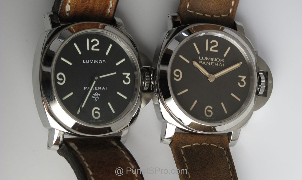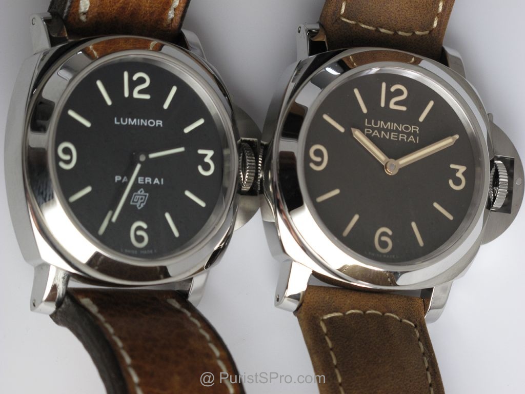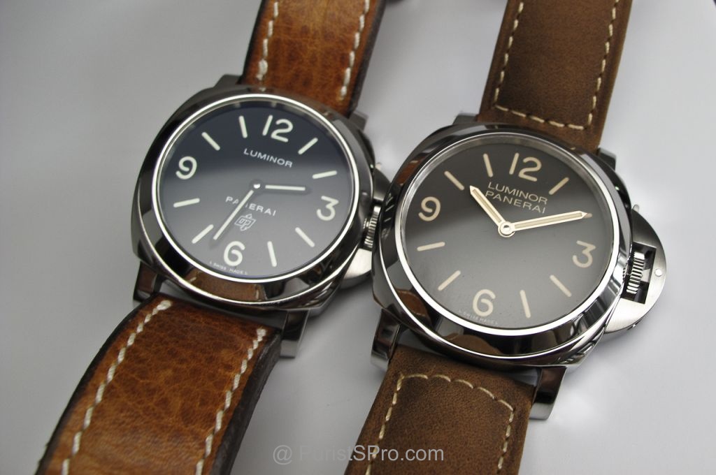 Now we start to compare and contrast. The PAM 000 and the PAM 390. The difference in dial color is pretty obvious. The "Zero" looks great also but the combo of aged patina, brown dial and gold hands make for nice showing.