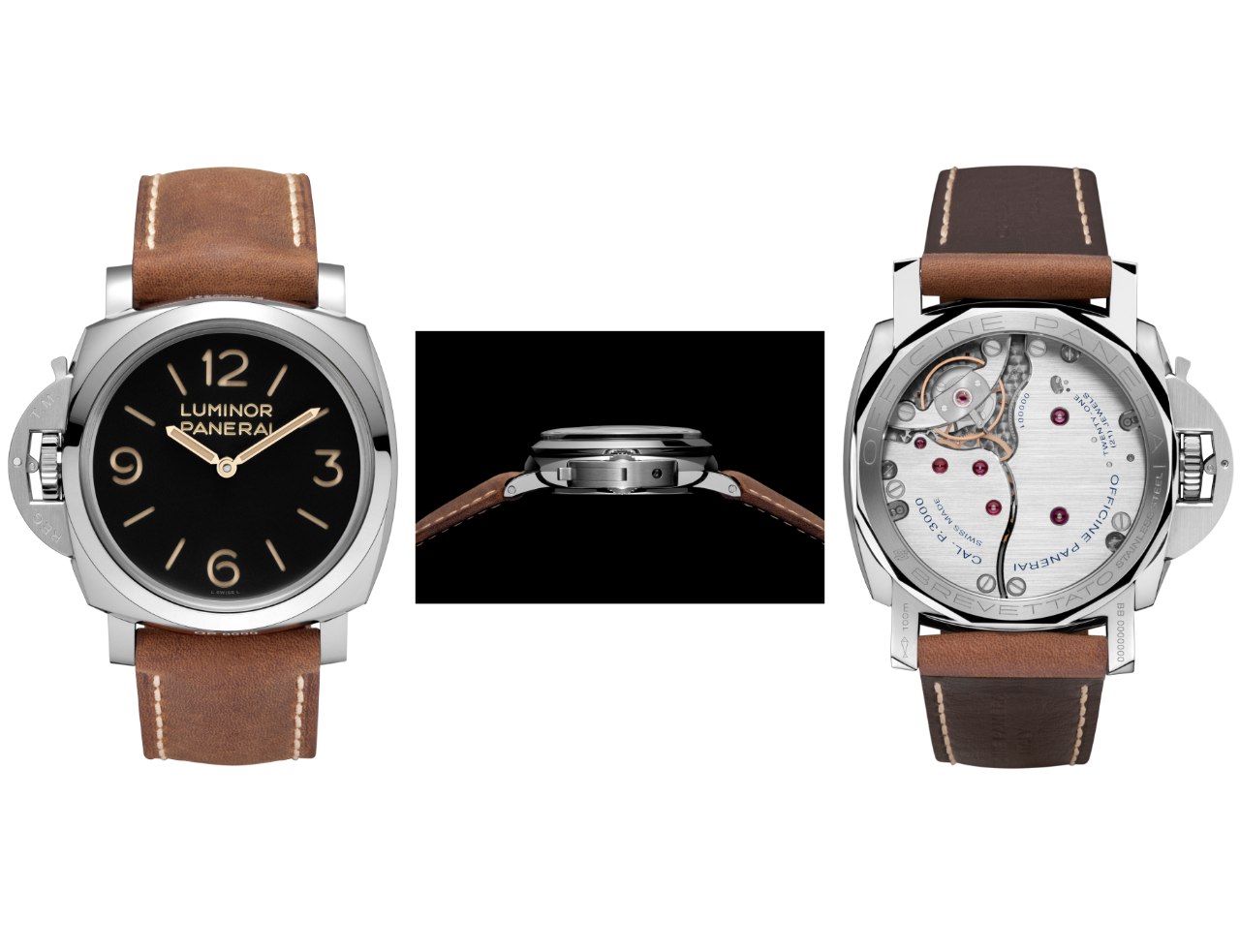 The watch features a 47mm polished steel case, a size characteristic of many historical Panerai instruments. It is fitted with a 3mm Plexiglas crystal, further enhancing its vintage appeal by replicating the material used in early models. The watch is powered by the in-house Calibre P.3000, a manual-wind movement known for its robust construction and a power reserve of three days. The solid case back maintains the historical integrity of the design.