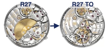 To do this they moved the train to the dial side, which means the second barrel has essentially been flipped upside down, as has its connection to the power reserve differential. What I referred to as the extra wheel is now two superimposed extra wheels, one drives the time and the other drives the rest of the train. Increased height on the dial side means the up/down no longer sits against the dial, and needs its own bridge. Those small bridges on the back bearing the Geneva seal and movement number are purely decorative, but arenât part of the main plate and can be removed. I speculate this is to make the tourbillon more accessible to the watchmaker. If you remove them youâll find a second hidden moment number engraving directly on the main plate.