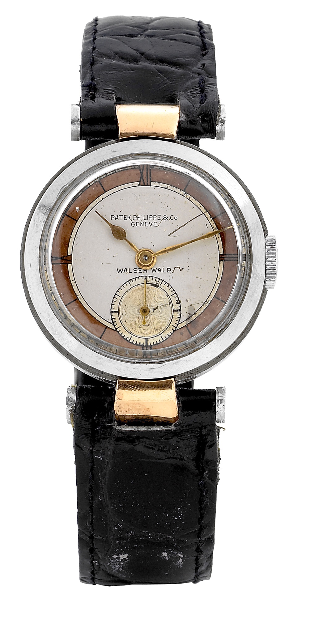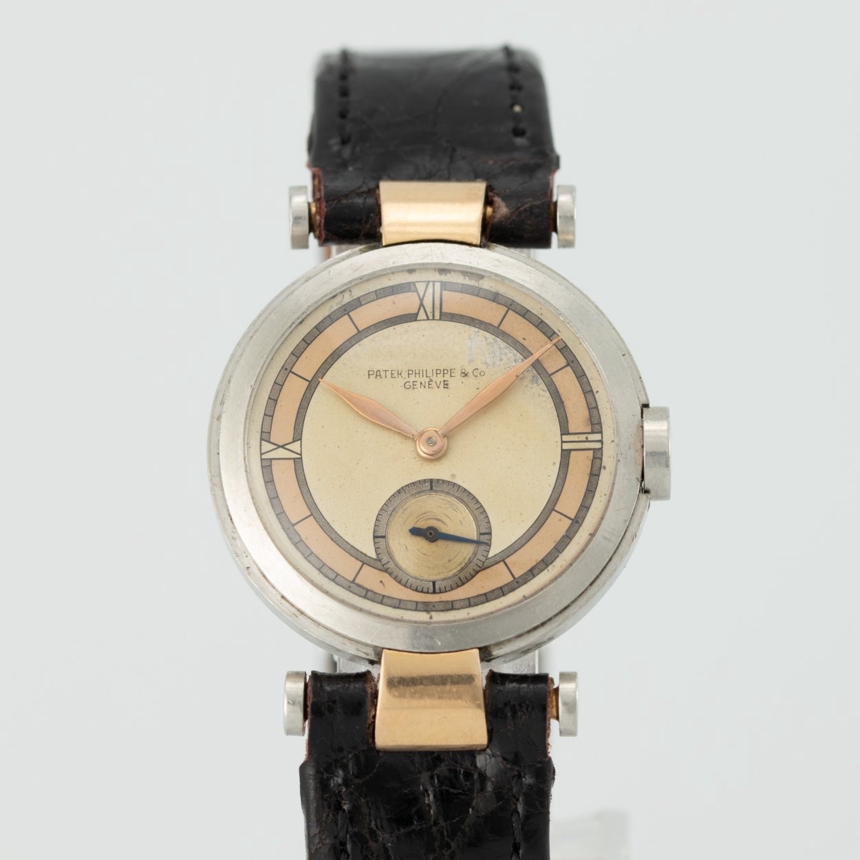 This particular example features a 30mm diameter case crafted from platinum and rose gold, a sophisticated combination for the period. It houses a manual-winding 10''' lever escapement movement, a testament to the precision watchmaking of the time. The watch is fitted with a three-colour dial, adding to its visual complexity and appeal.