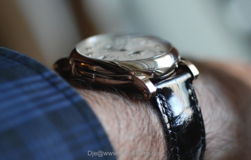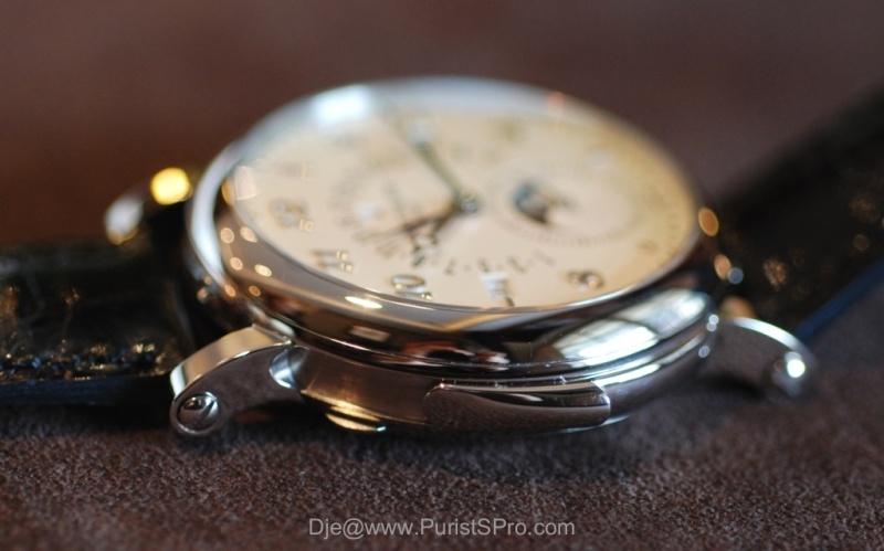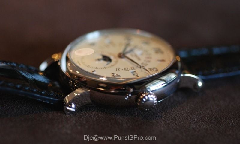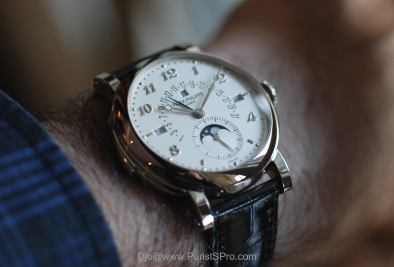At 40.5 mm, this MR shouts for attention, not your understated Patek. Sorry to see PP is going for larger diameters big time. This must be the TS effect, since HS is retired. FYI, I had a chance to examine and wore 5159G on many occasions. The very busy dial and the 39 mm diameter case was no go for me. The forced fit of the 5059 mechanism to a larger 5159 case also looked tentative. The design of the 5213 looks even worse due to the disproportionately small day and month windows and the larger