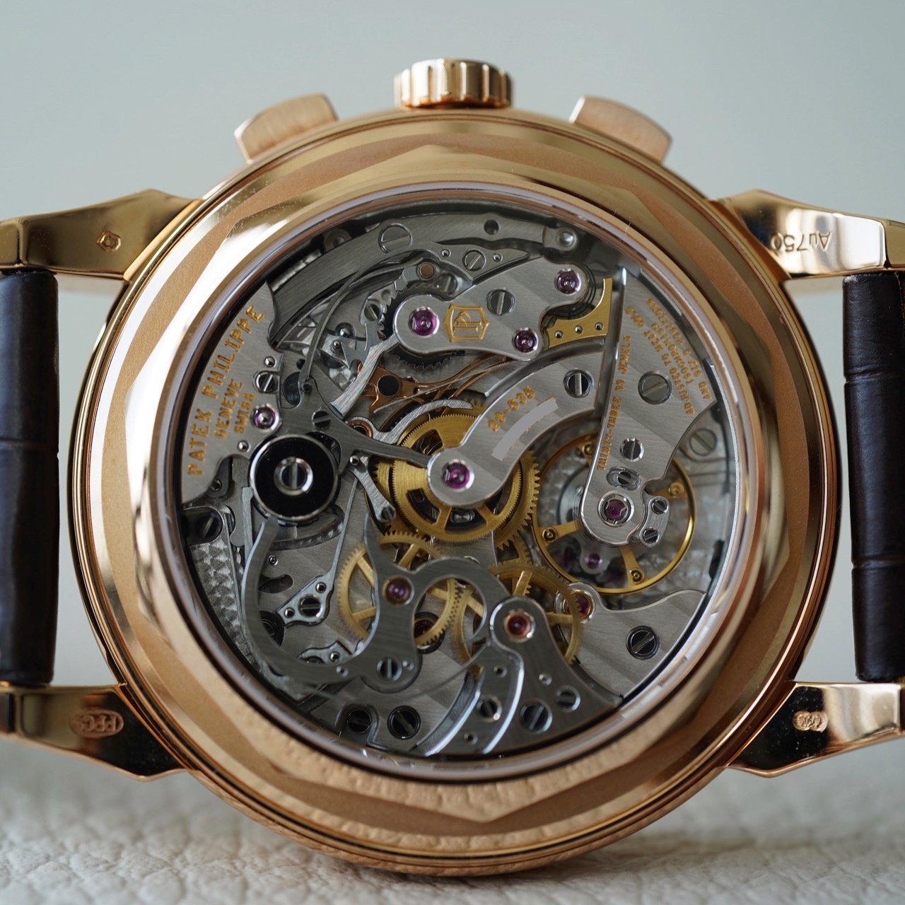 This specific reference features an 18k yellow gold case, measuring 41mm in diameter. It houses the manually wound caliber CH 29-535 PS Q, an integrated movement developed and manufactured entirely by Patek Philippe. The movement is visible through a sapphire crystal case back, showcasing its intricate finishing and traditional architecture. The power reserve for this caliber is approximately 55 to 65 hours.