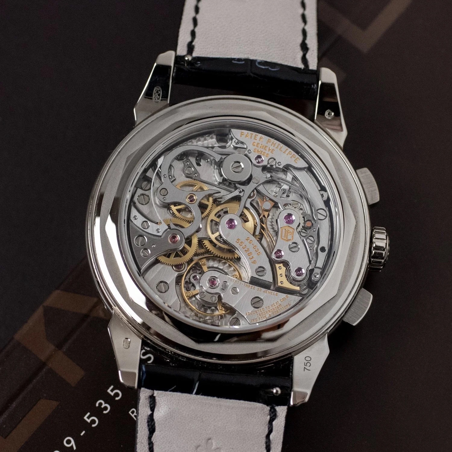 The watch features a 41mm white gold case, distinguished by a concave bezel and two-tier lugs, contributing to its refined profile. It houses the caliber CH 29-535 PS Q, a manually wound movement developed and manufactured entirely by Patek Philippe. This movement integrates a perpetual calendar with day, month, leap year, and day/night indications, alongside a chronograph function with a 30-minute counter and a moon phase display. The power reserve for this caliber is approximately 55 to 65 hours, and it is protected by a sapphire crystal.