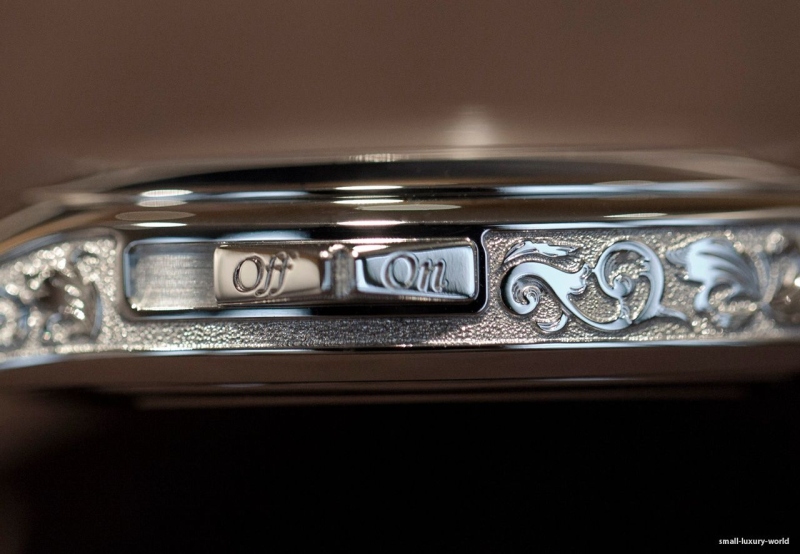 I was told the striking mechanism is a delight for the ear, but I had no chance to test it. I am quite picky here, but would expect only the best from Patek Philippe. At the top of each hour, a hammer strikes a single blow on a gong, in perfect synchrony with the instantaneous jump in the aperture. The sound indication may be de-activated at will, using the small slide at 10 o´cock.