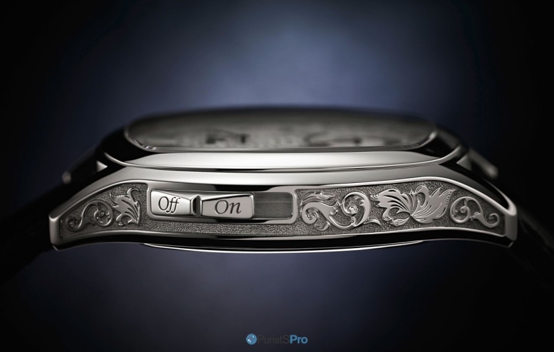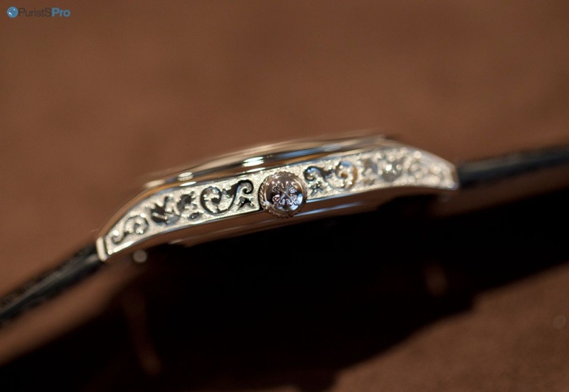 The engraved case is in platinum, its dimensions are 39.8mm x 47.4mm and with a height of 11.3mm.