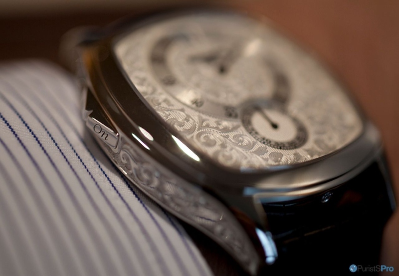 The first time I saw it behind glass it got my attention for several reasons – good and bad. I have a weakness for jumping hour watches in general and a soft spot for tonneau-shaped cases, but I was not sure about the hour strike complication and the amount of decor – on the first view.