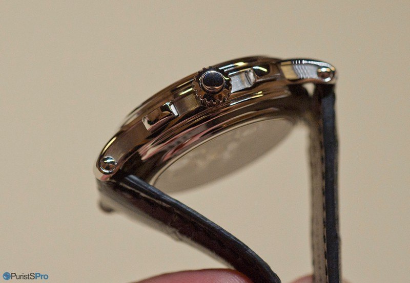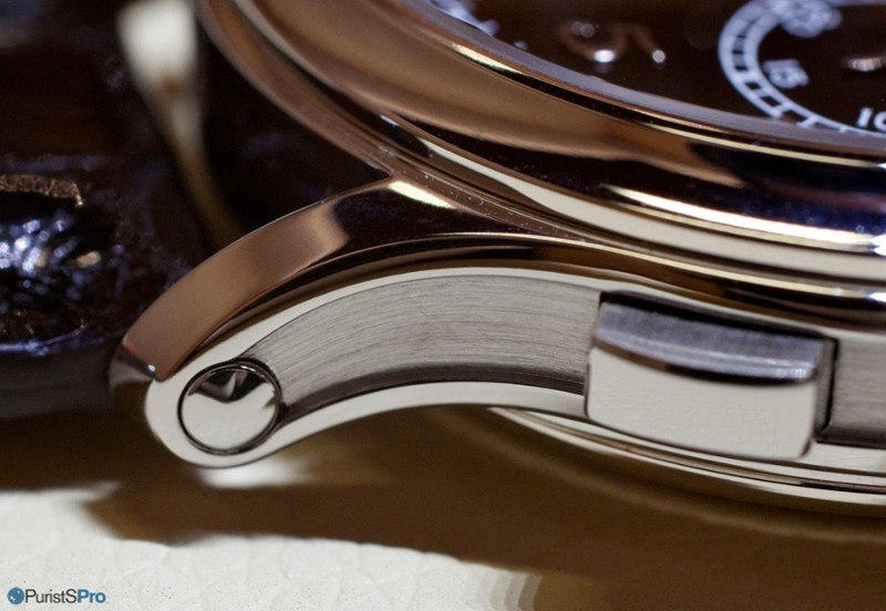 However, when you look at it from the side, you easily notice what I think is a first in Patek Philippe history with the long grooved case band, going from one lug to the other. This decorative element is brushed: making it a polished surface, aside from being near impossible to realize, would not have look as nice as it would have suited a more standard case shape instead.