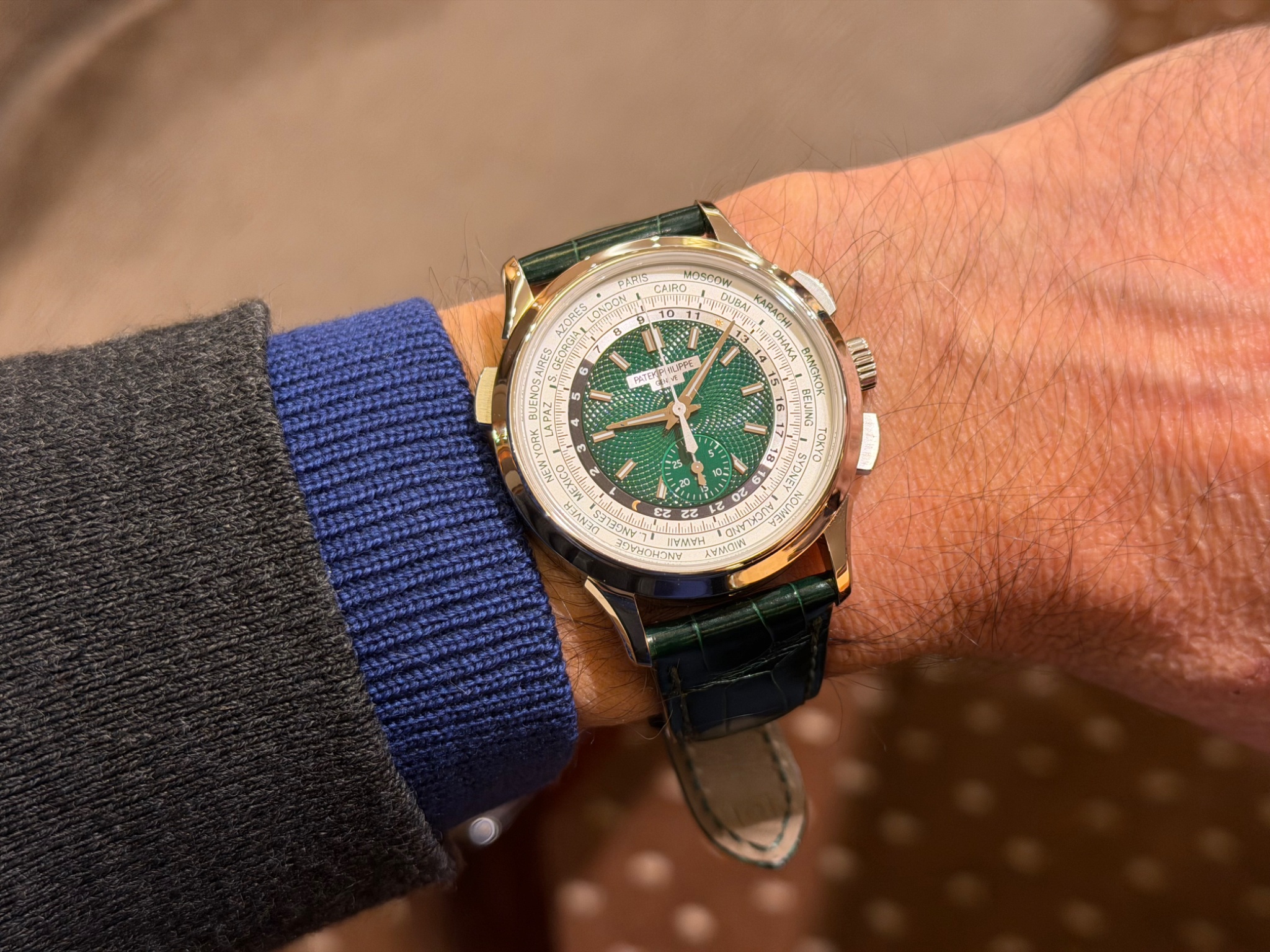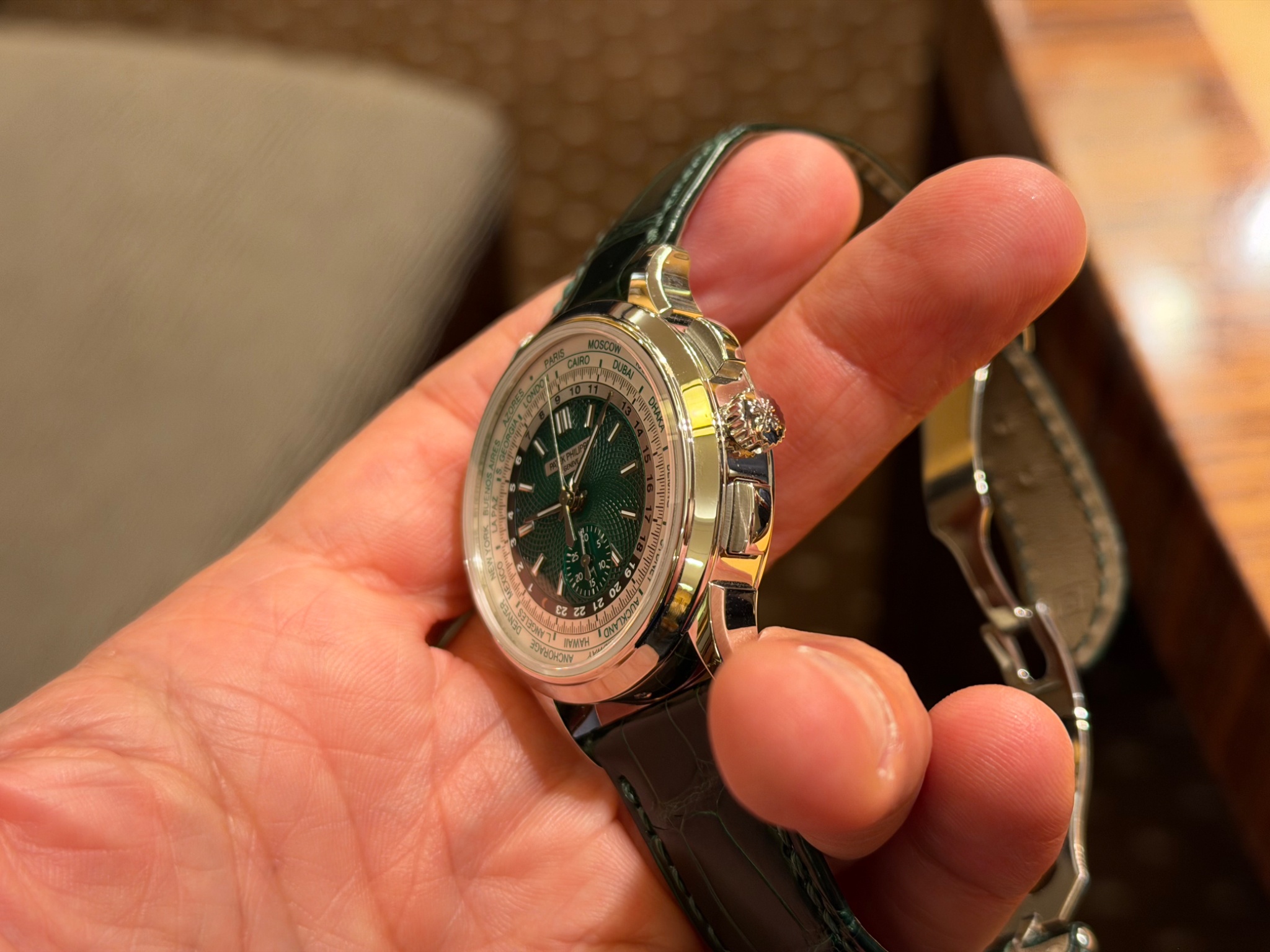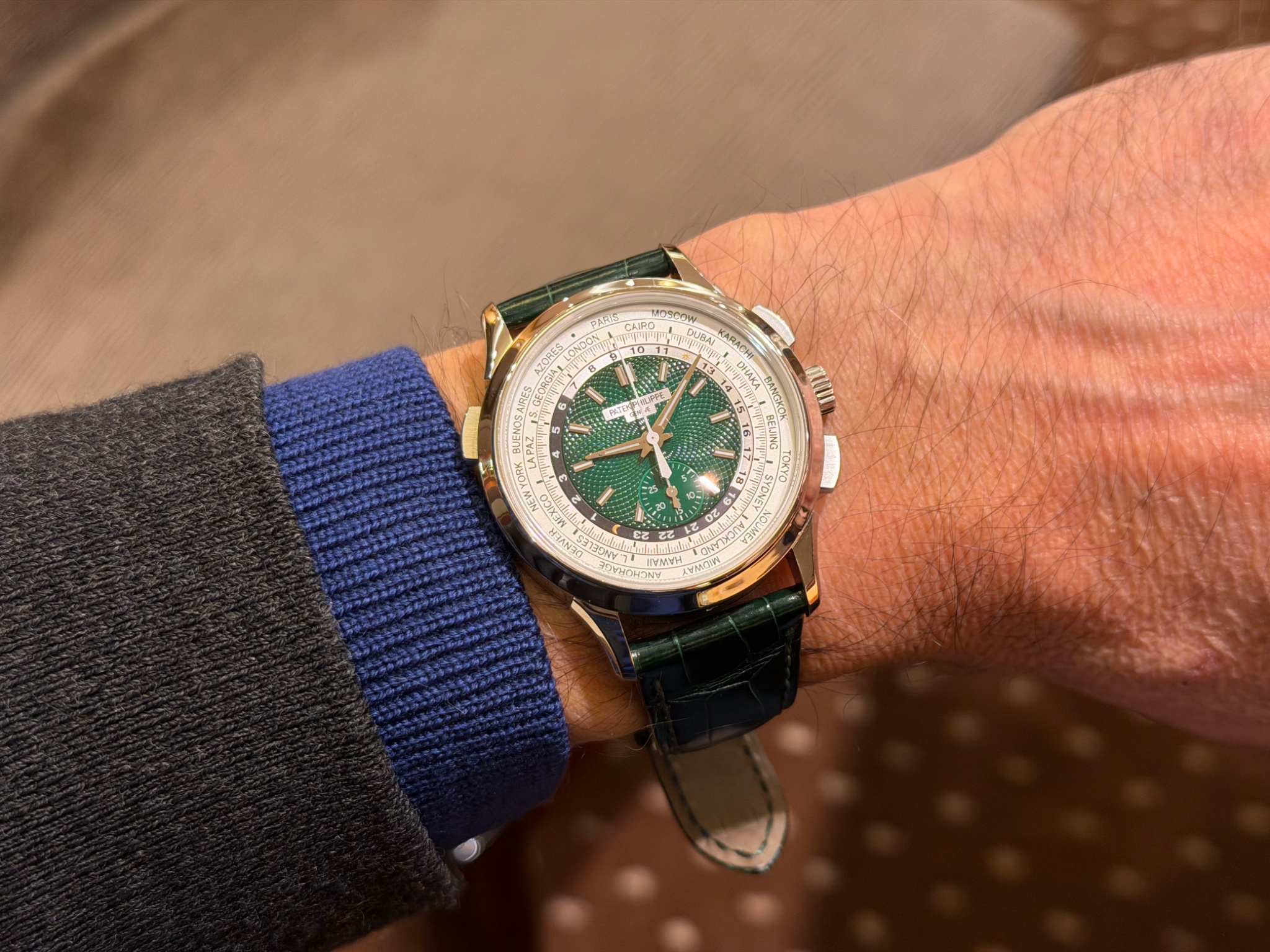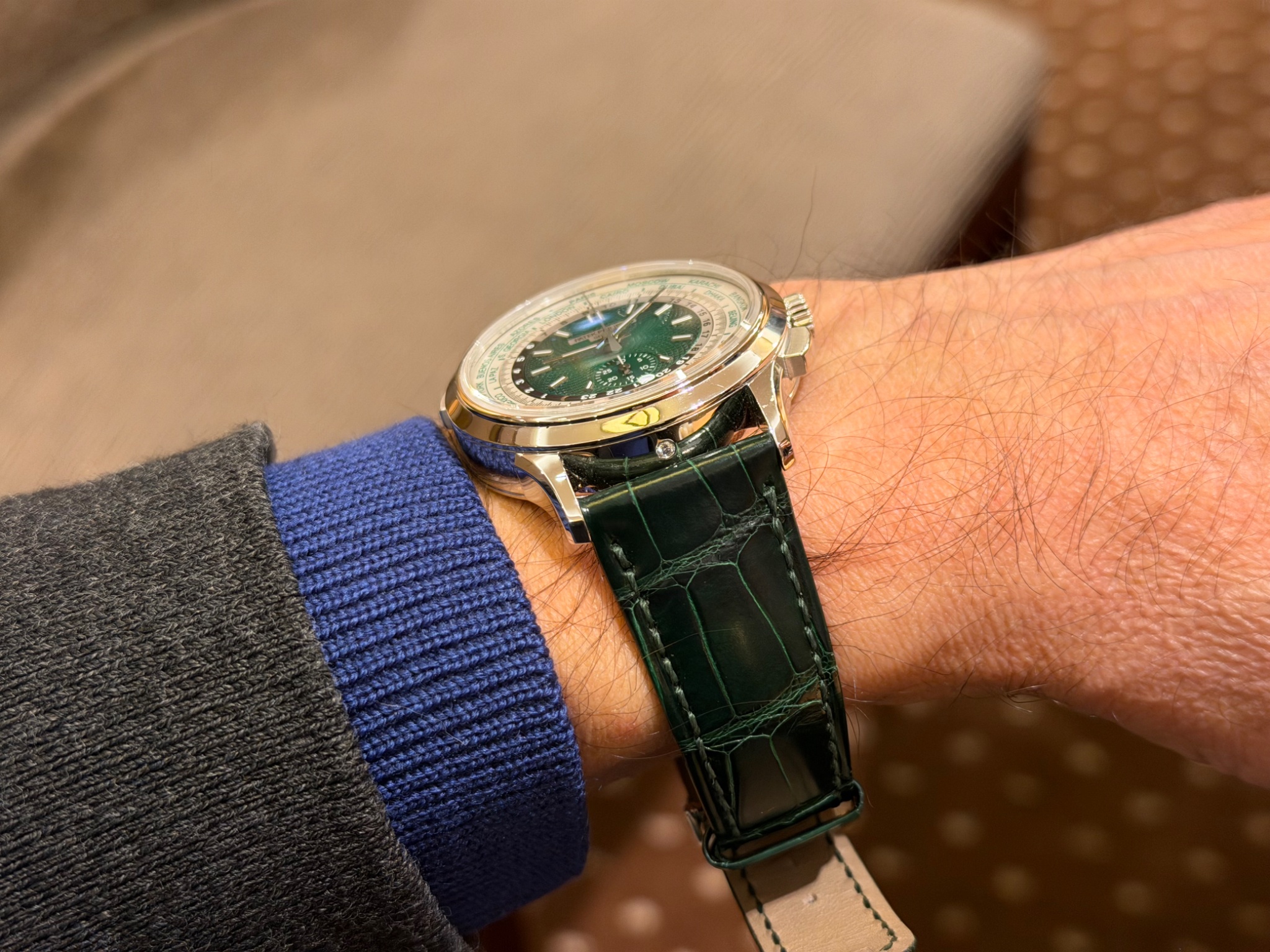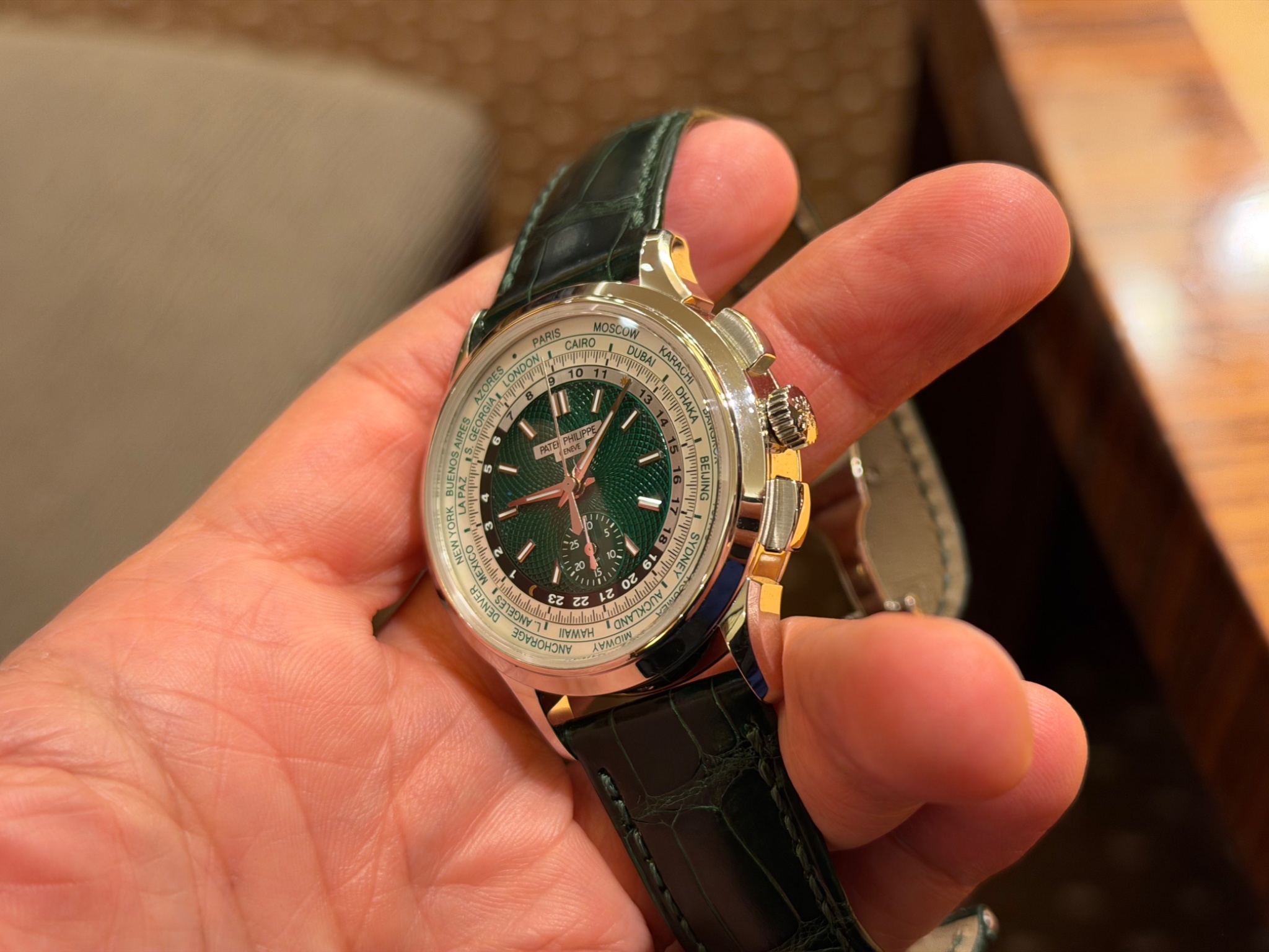 This reference appeals to collectors who appreciate the technical complexity of combining a world time function with a flyback chronograph. The platinum case and green dial variant offers a specific visual identity within the Complications collection. While the 30-minute counter's scale may be noted by some, the overall execution of the dial and the combination of functions remain central to its appeal.