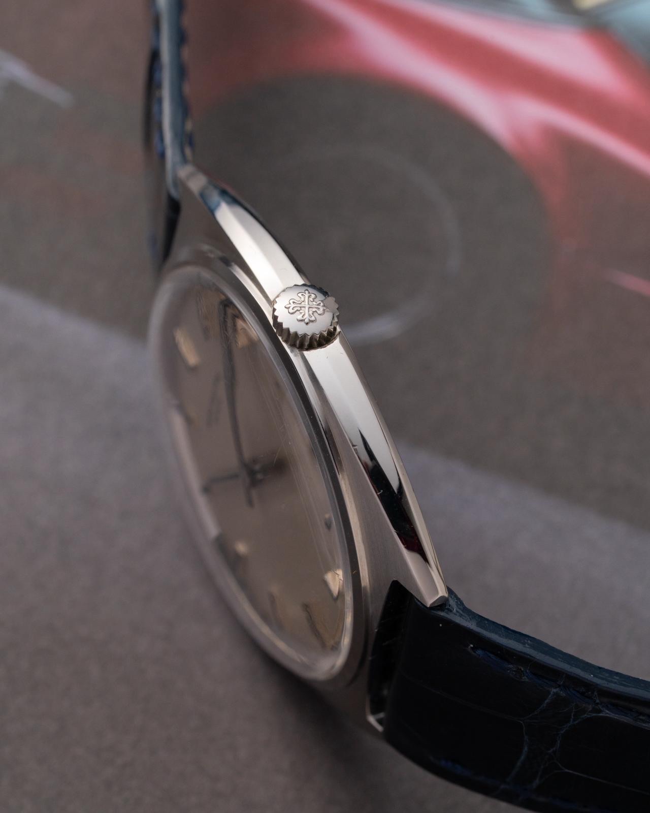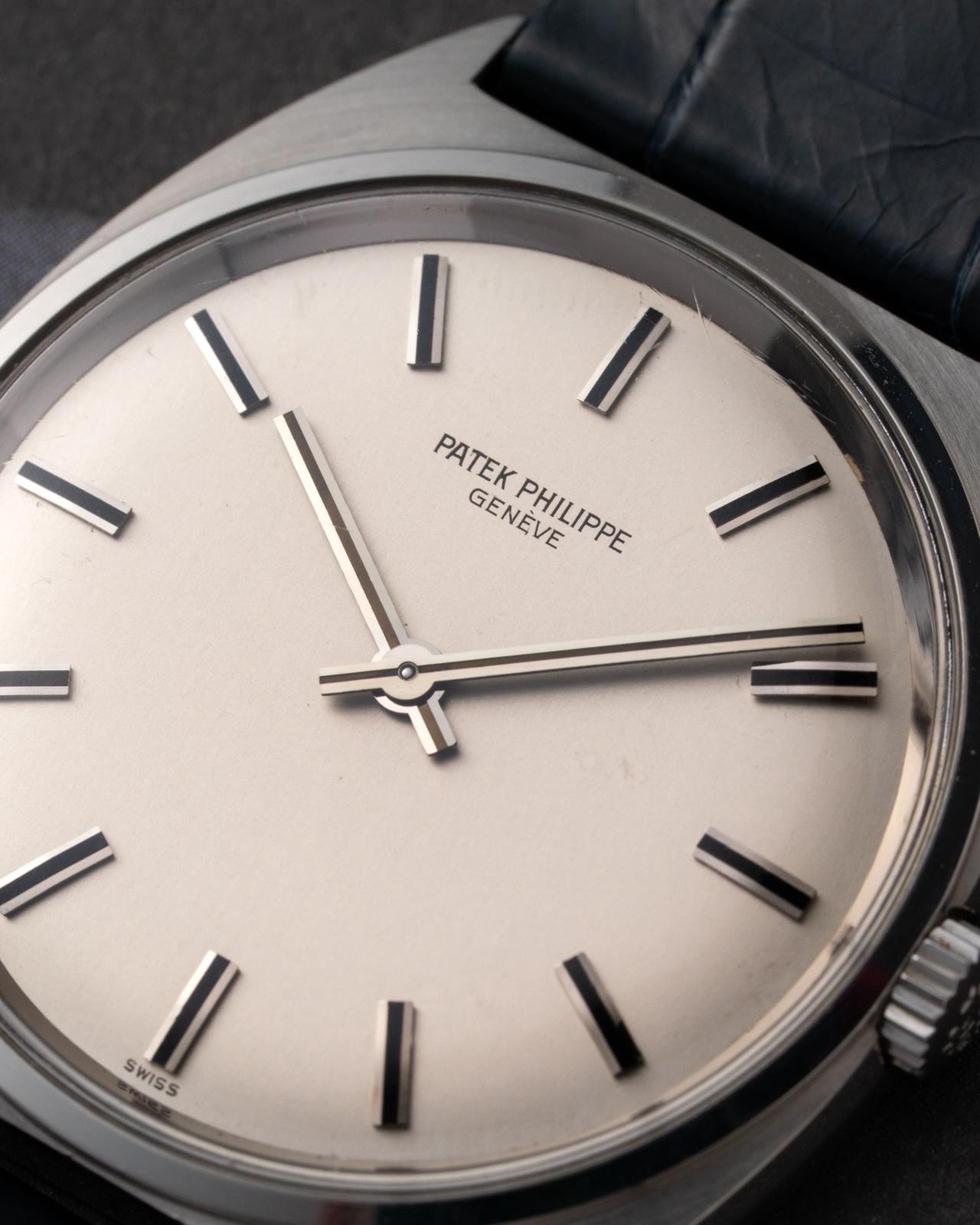The steel cushion case of the reference 3574 measures 35 x 8 x 40 mm, providing a substantial yet wearable presence on the wrist. It is powered by a manual-winding movement, consistent with many Patek Philippe dress watches of the era, ensuring a slim profile. The crystal is likely Hesalite, a common material for watches from this period, contributing to its vintage authenticity.