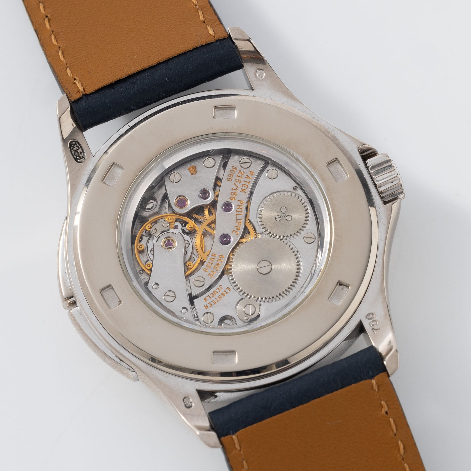 Encased in either 18k white gold or 18k rose gold, the 5124 features a case measuring 36 mm in diameter and 46 mm from lug to lug, providing a balanced presence on the wrist. It is powered by the manual-wind caliber 25-21 REC PS, offering a power reserve of 44 hours. The watch is fitted with a sapphire crystal, ensuring clarity and scratch resistance, and has a water resistance rating of 30 meters, suitable for everyday wear.
