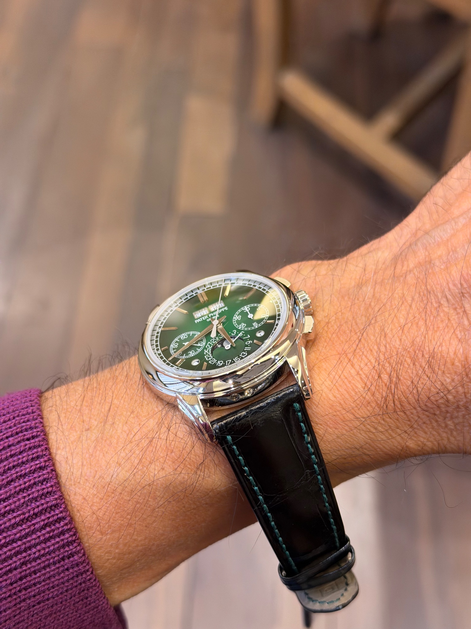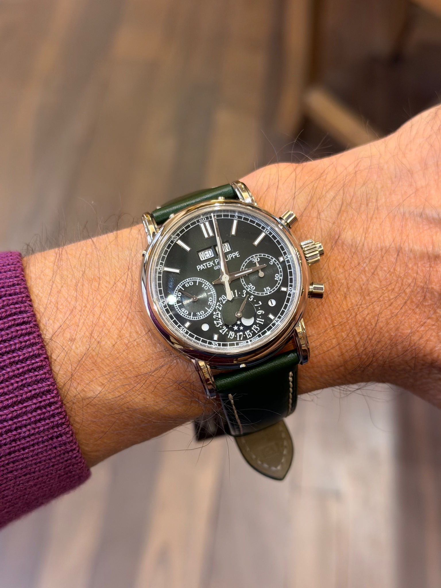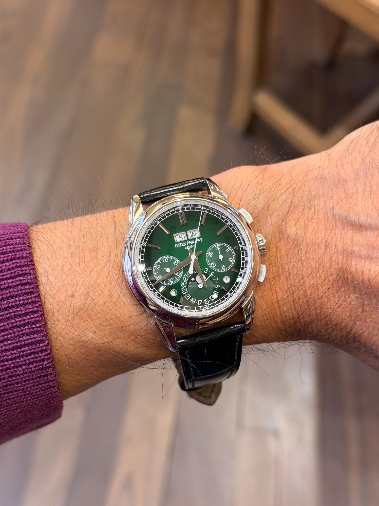 This reference appeals to collectors seeking a perpetual calendar chronograph with a modern yet refined appearance. The green and black-gradient dial offers a fresh alternative to more traditional dial colors, making it a notable piece within the broader Patek Philippe grand complications catalog. Its platinum construction further underscores its position as a significant offering.
